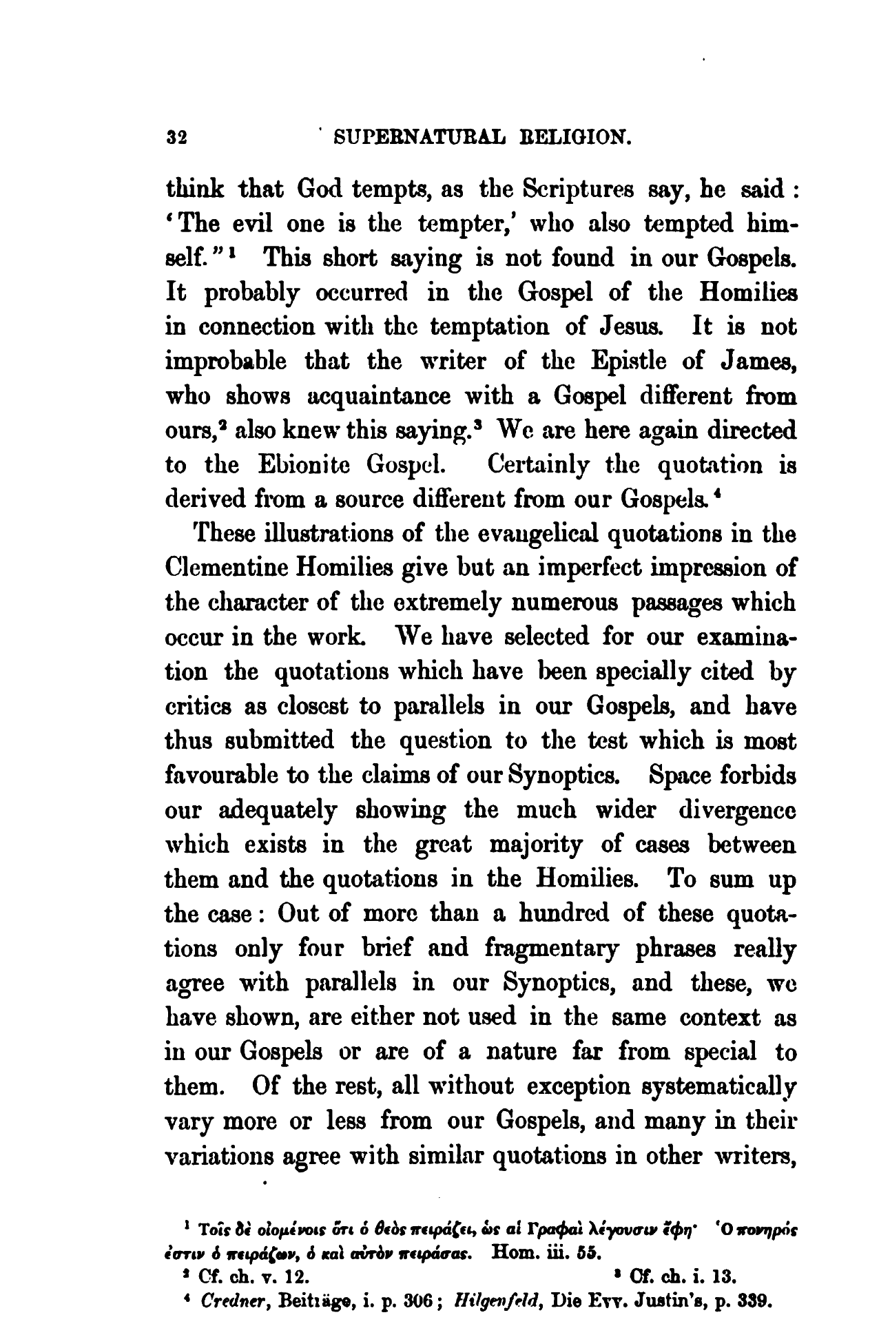 As it is impossible here to examine in detail all of the quotations in the Clementine Homilies, we must content ourselves with this distinct statement of their character, and merely illustrate briefly the different classes of quotations, exhausting, however, those which literally agree with passages in the Gospels. The most determined of recent Apologists do not afford us an opportunity of testing the passages upon which they base their assertion of the use of our Synoptics, for they simply assume that the author used them without producing instances.(1)