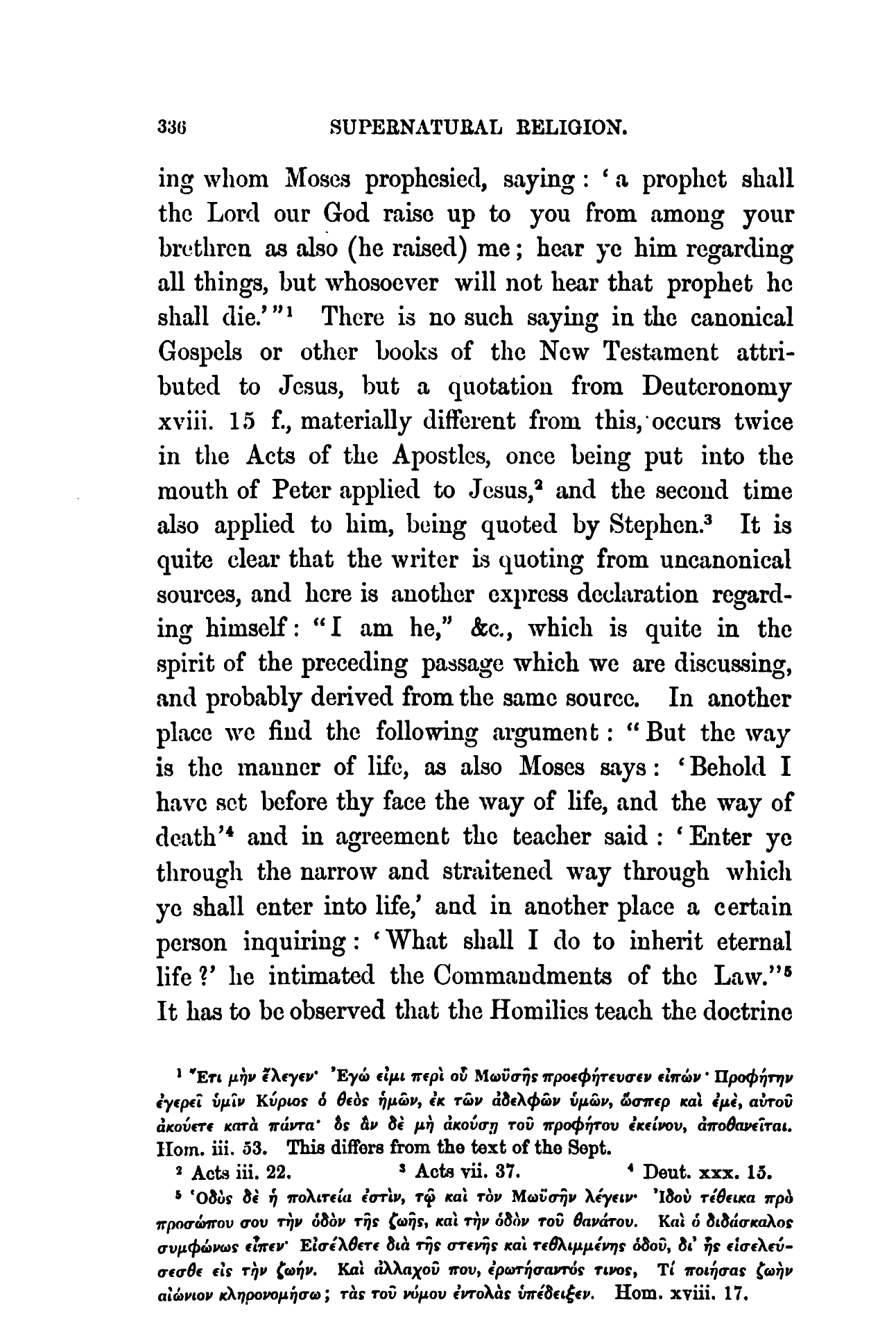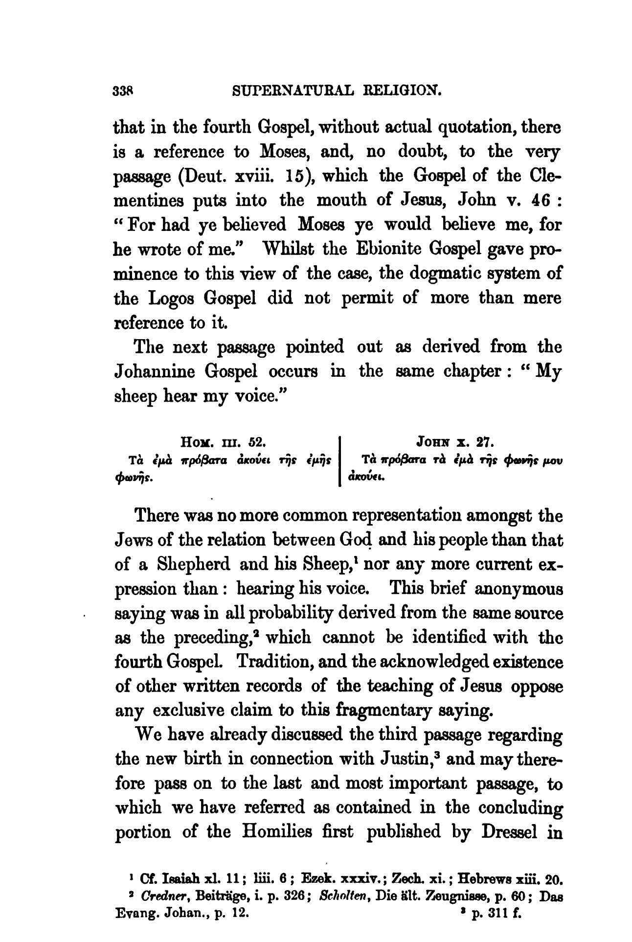 We have already quoted the opinion of De Wette as to the inconclusive nature of the deductions to be drawn from the quotations in the pseudo-Clementine writings regarding their source, but in pursuance of the plan we have adopted we shall now examine the passages which he cites as most nearly agreeing with our Gospels.(3) The first of these occurs in Hom. iii. 18: "The Scribes and the Pharisees sit upon Moses' seat; all things therefore, whatsoever they speak to you, hear them," which is compared with Matt, xxiii. 2, 3: "The Scribes and the Pharisees sit upon Moses' seat; all things therefore, whatsoever they say to you, do and observe." We subjoin the Greek of the latter half of these passages.