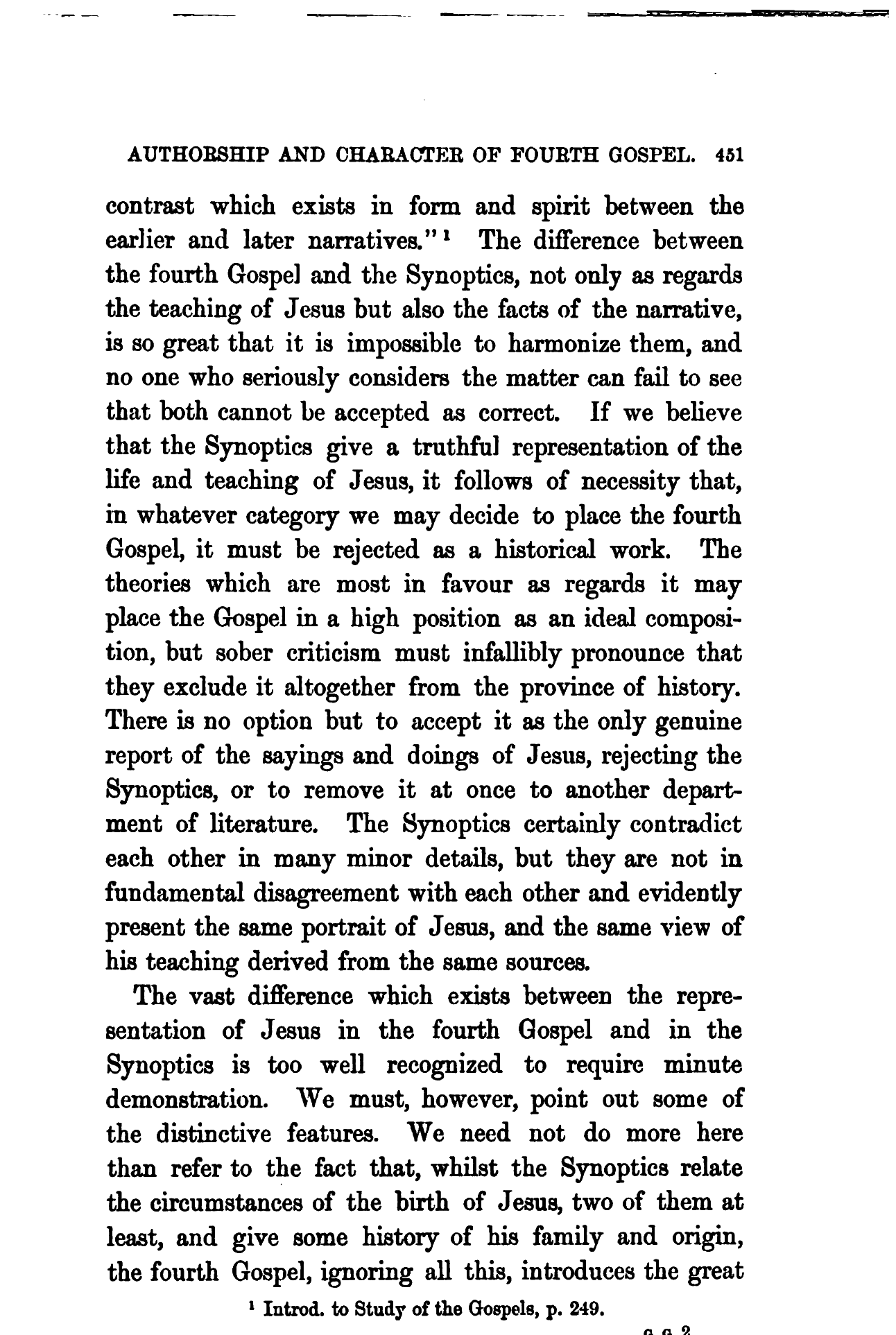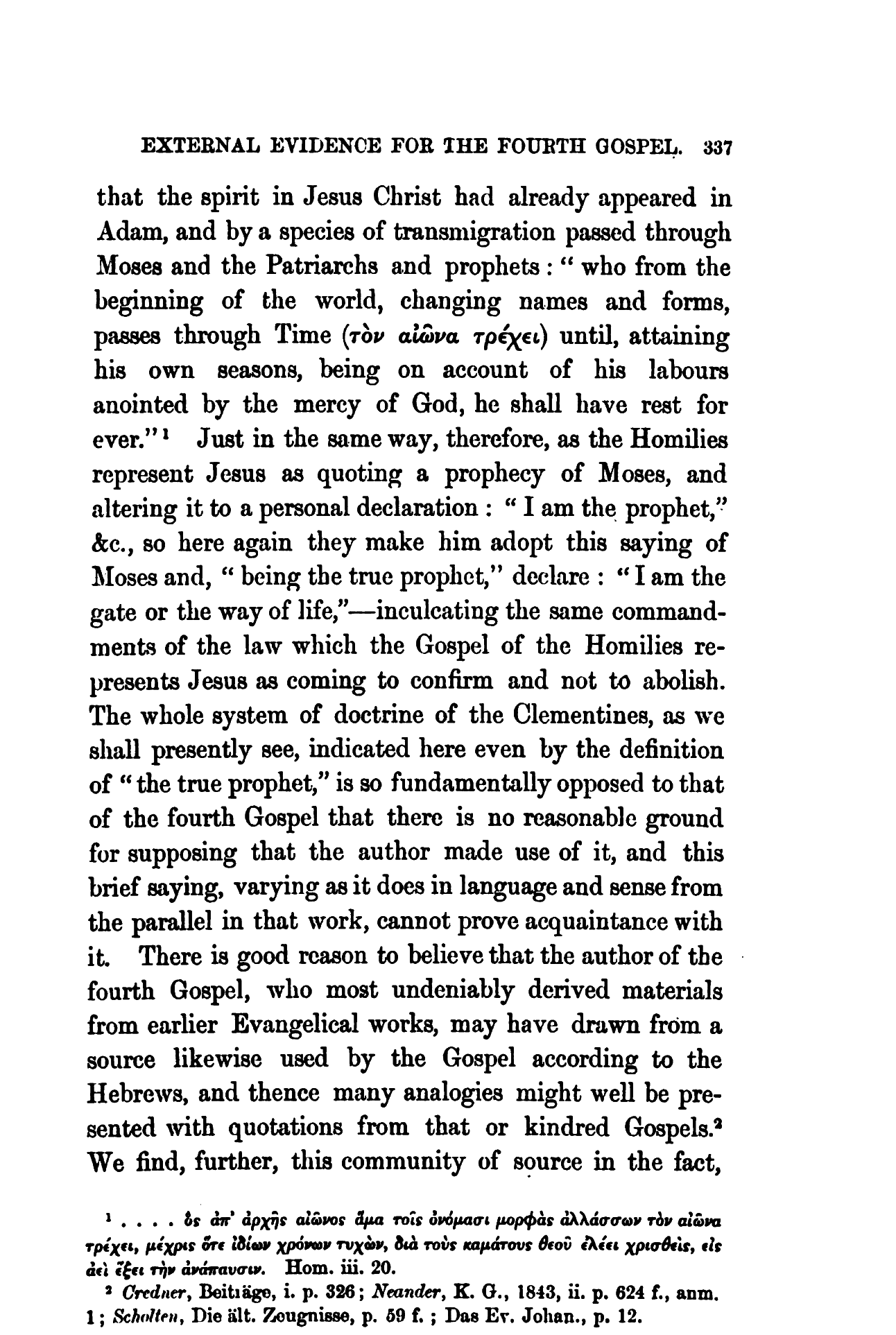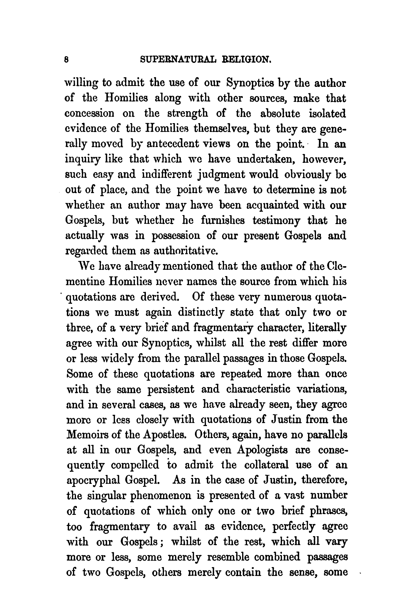 willing to admit the use of our Synoptics by the author of the Homilies along with other sources, make that concession on the strength of the absolute isolated evidence of the Homilies themselves, but they are generally moved by antecedent views on the point. In an inquiry like that which we have undertaken, however, such easy and indifferent judgment would obviously be out of place, and the point we have to determine is not whether an author may have been acquainted with our Gospels, but whether he furnishes testimony that he actually was in possession of our present Gospels and regarded them as authoritative.