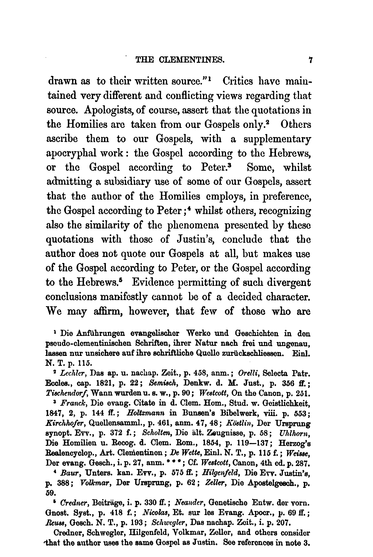 drawn as to their written source."(1) Critics have maintained very different and conflicting views regarding that source. Apologists, of course, assert that the quotations in the Homilies are taken from our Gospels only.(2) Others ascribe them to our Gospels, with a supplementary apocryphal work: the Gospel according to the Hebrews, or the Gospel according to Peter.(3) Some, whilst admitting a subsidiary use of some of our Gospels, assert that the author of the Homilies employs, in preference, the Gospel according to Peter;(4) whilst others, recognizing also the similarity of the phenomena presented by these quotations with those of Justin's, conclude that the author does not quote our Gospels at all, but makes use of the Gospel according to Peter, or the Gospel according to the Hebrews.(5) Evidence permitting of such divergent conclusions manifestly cannot be of a decided character. We may affirm, however, that few of those who are