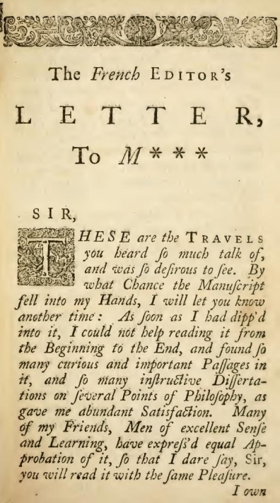 These are the TRAVELS you heard so much talk of, and was so desirous to see. By what Chance the Manuscript fell into my Hands, I will let you know another time: As soon as I had dipp'd into it, I could not help reading it from the Beginning to the End, and found so many curious and important Passages in it, and so many instructive Dissertations on several Points of Philosophy, as gave me abundant Satisfaction. Many of my Friends, Men of excellent Sense and Learning, have express'd equal Approbation of it, so that I dare say, Sir, you will read it with the same Pleasure.
