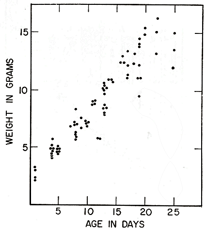 Previous studies of growth in Microtus have been based almost entirely on weights. However, the weight of an individual vole may fluctuate widely over a short period, depending on pregnancy and parturition, length of time in a trap without food, availability of moisture, and other factors. In the course of my study, in 1954 [Pg 132] and 1955, and parts of 1953 and 1956, measurements of total length, in addition to weights, were recorded for most of the voles live-trapped.