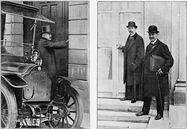 | Devant l'hôtel particulier du Président du Conseil: M. Millerand va confirmer à M. Poincaré sa décision de lui rendre le portefeuille de la Guerre. |