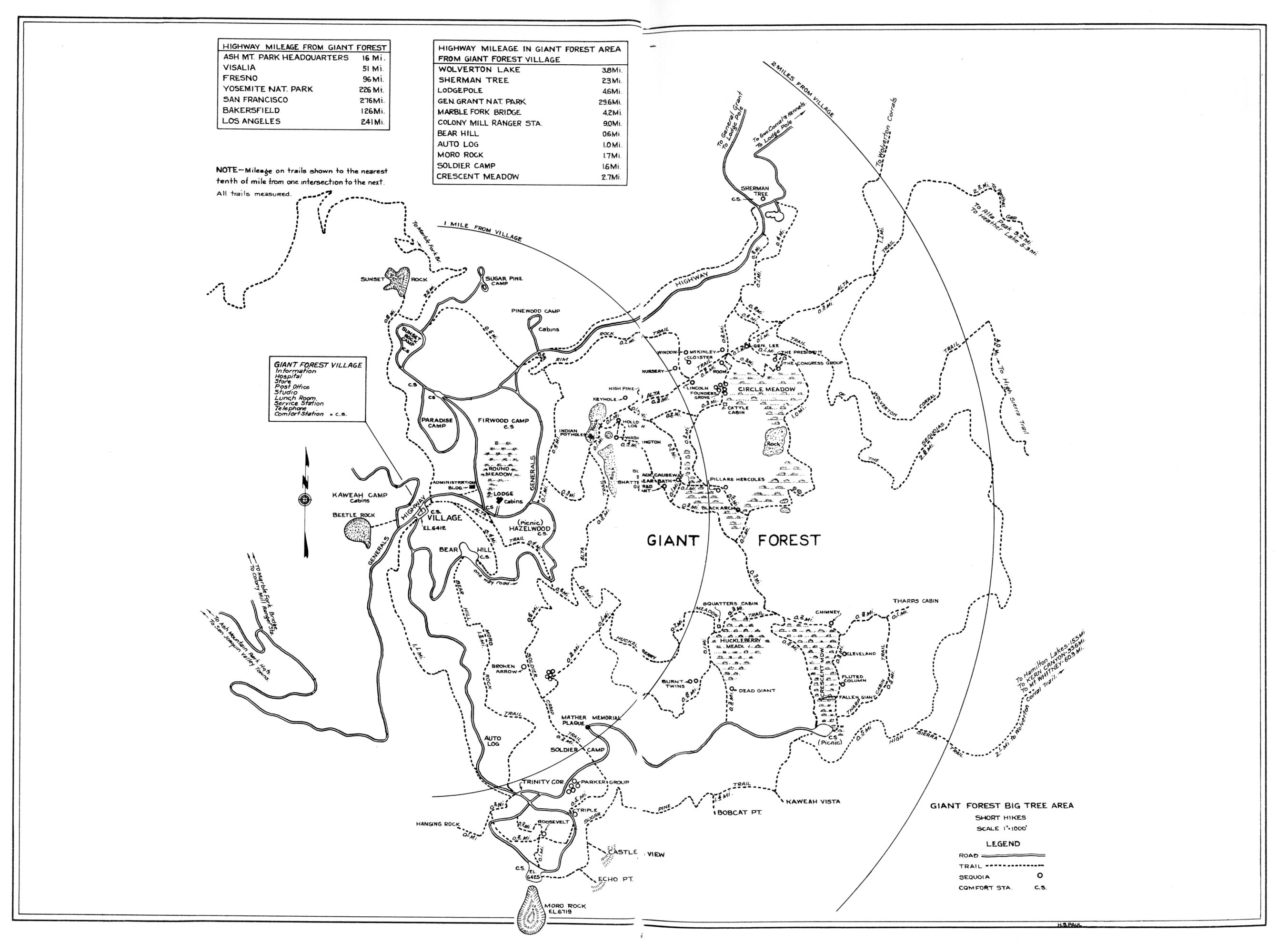 One-Day Stay.—Should include the Sherman Tree, Lodgepole Camp, Moro Rock, Parker Group, Crescent Meadow, and Tharp Cabin Log in the Giant Forest district. A drive out the Generals Highway to Lost Grove and General Grant National Park should be included.