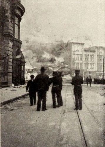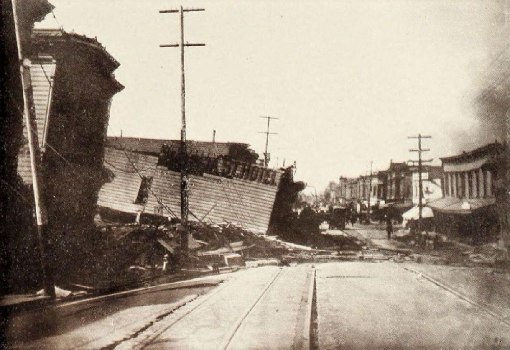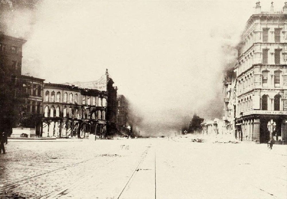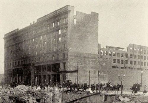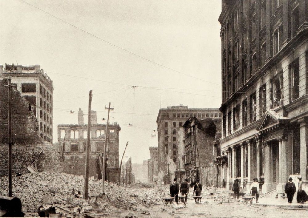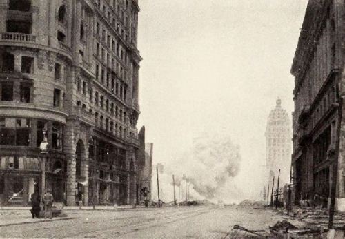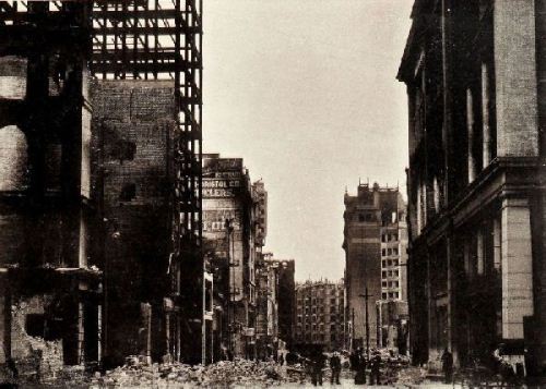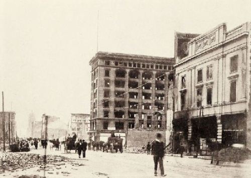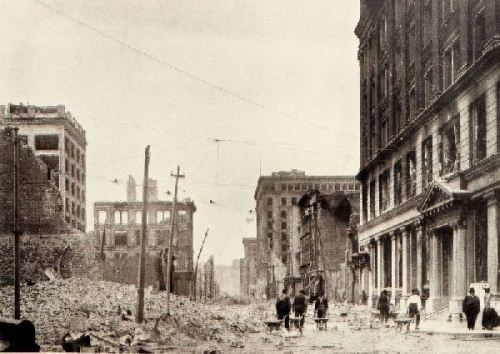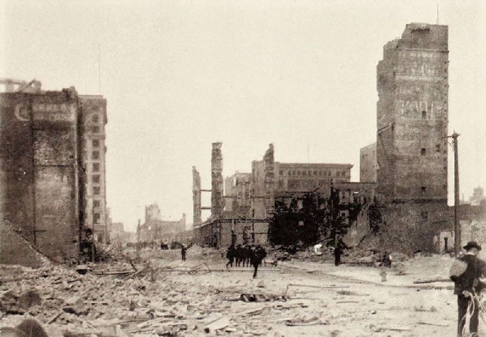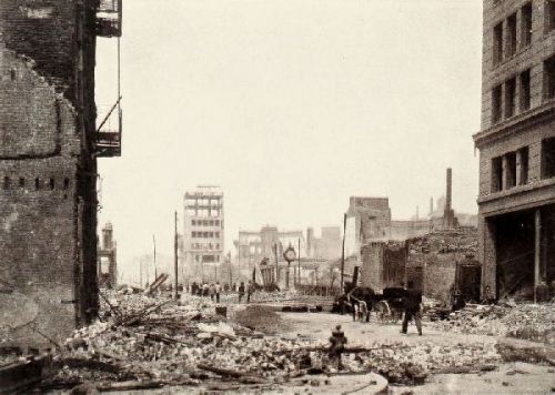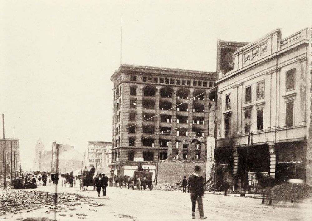 At no point in the affected area were the earthquake shocks so severe and destructive as in the down town district, south of Market and east of Kearny streets, where were the large office buildings, newspaper offices, banks, wholesale stores and warehouses, the occupants of which conducted the business, commerce and financial engagements of not only the major portion of the Pacific Slope, but a large and constantly-growing Oriental trade as well. The opportune hour of the morning was all that saved the lives of the untold thousands who labored there, but had not as yet left their homes in the residence sections of the ill-fated city.