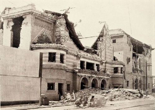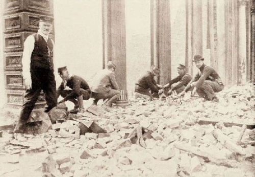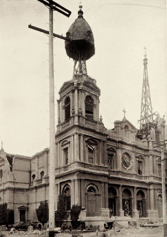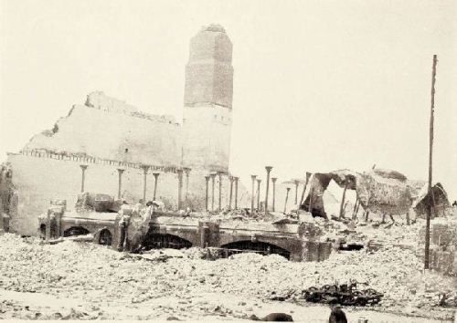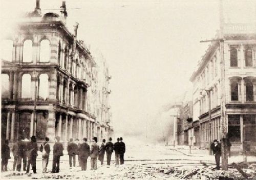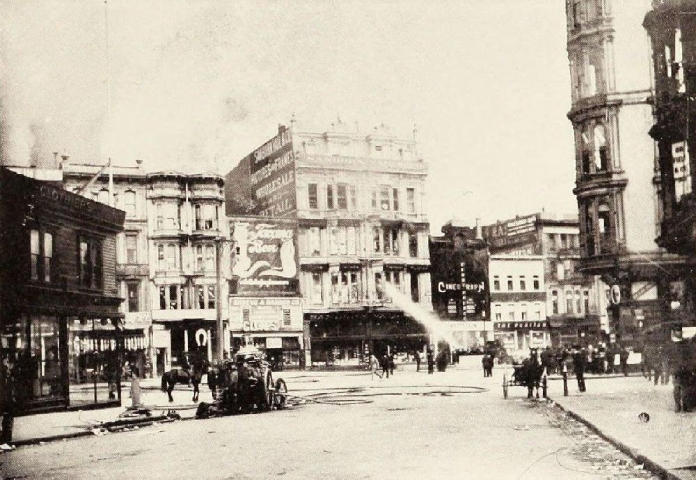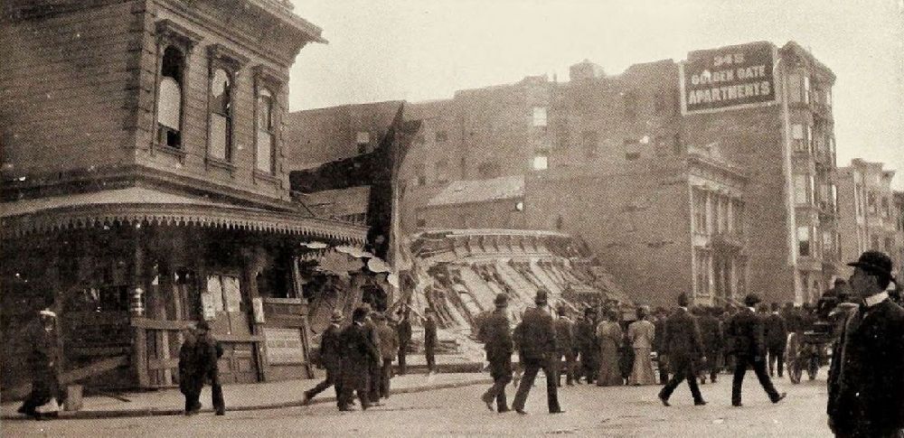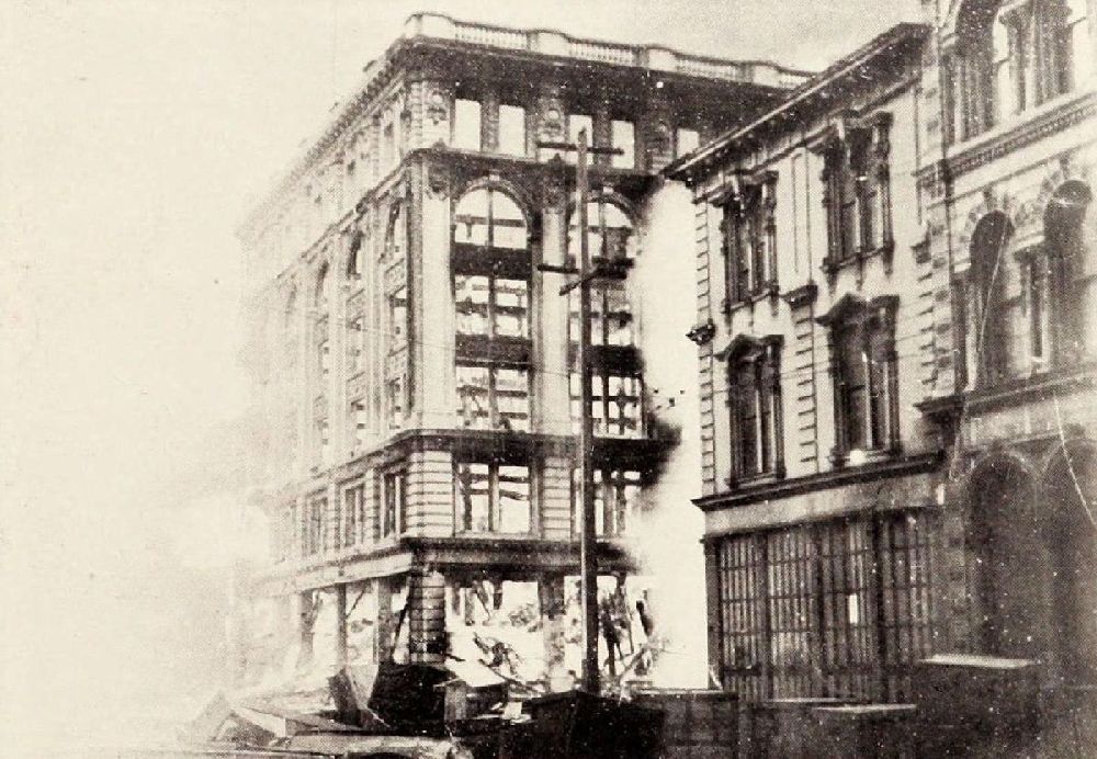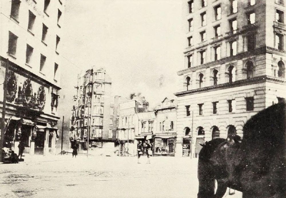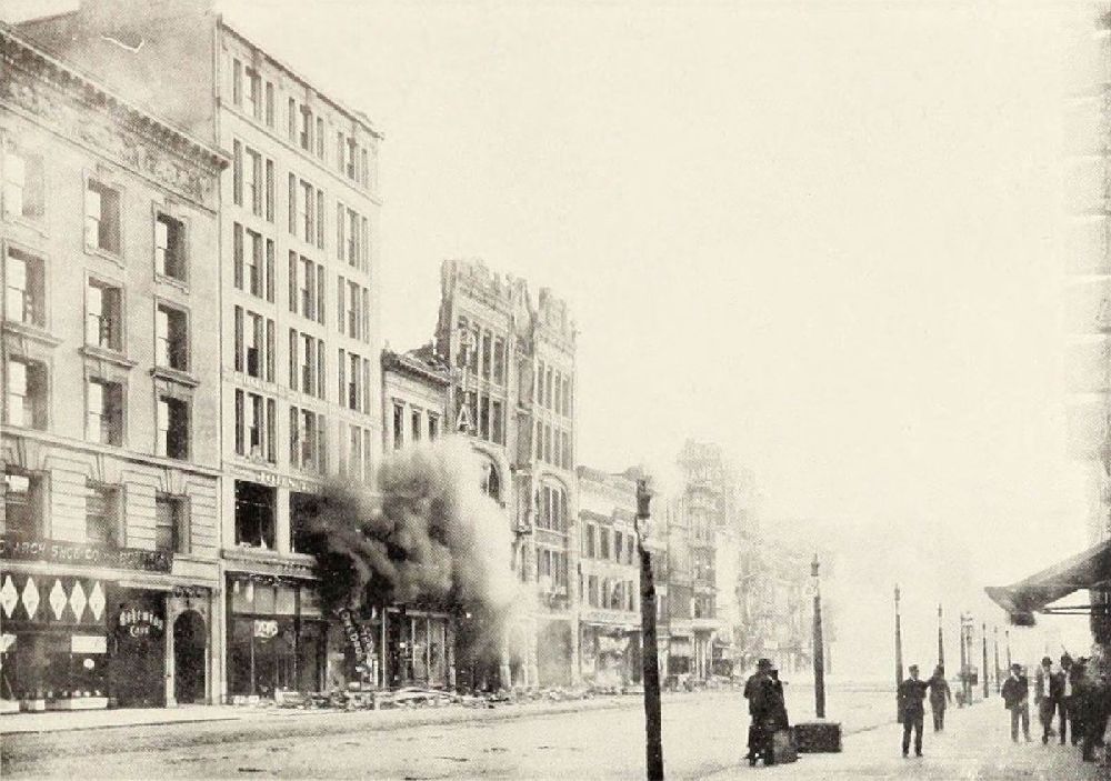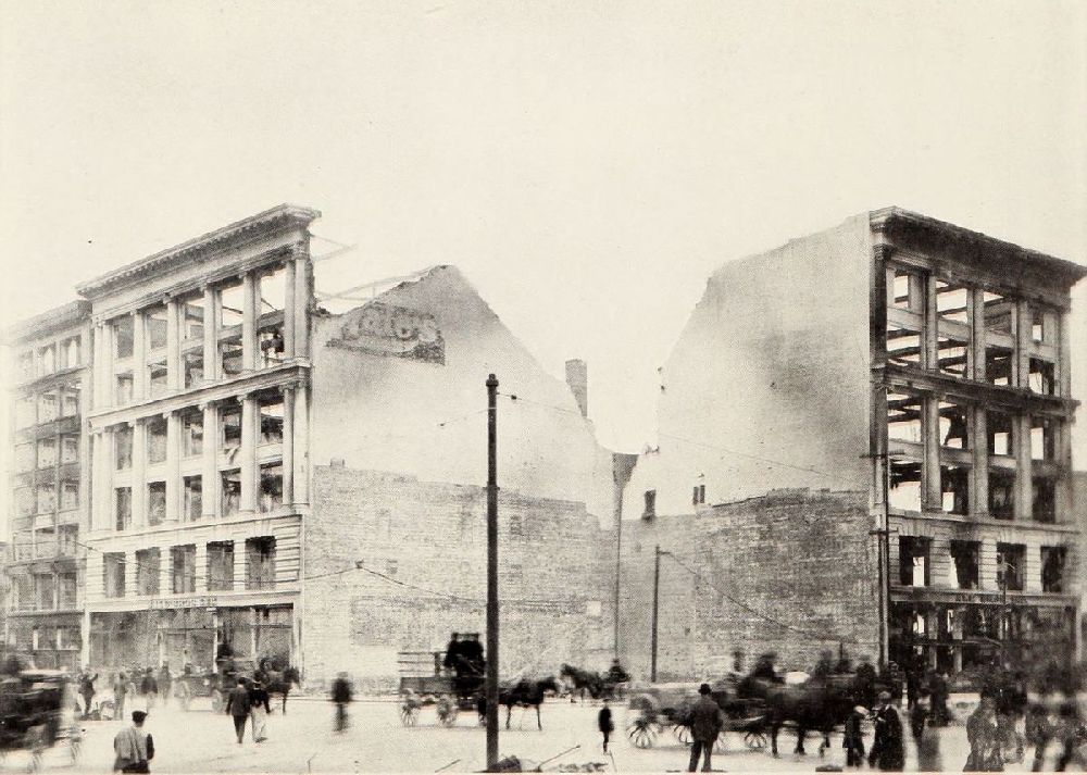 At no point in the affected area were the earthquake shocks so severe and destructive as in the down town district, south of Market and east of Kearny streets, where were the large office buildings, newspaper offices, banks, wholesale stores and warehouses, the occupants of which conducted the business, commerce and financial engagements of not only the major portion of the Pacific Slope, but a large and constantly-growing Oriental trade as well. The opportune hour of the morning was all that saved the lives of the untold thousands who labored there, but had not as yet left their homes in the residence sections of the ill-fated city.
