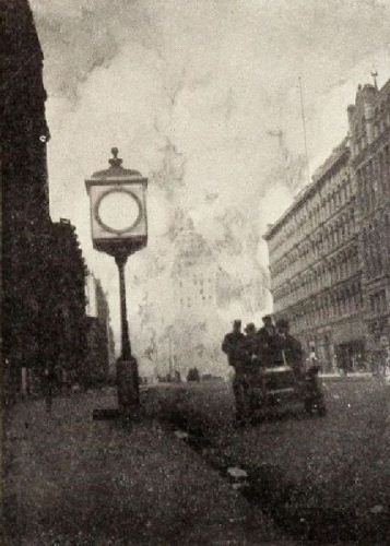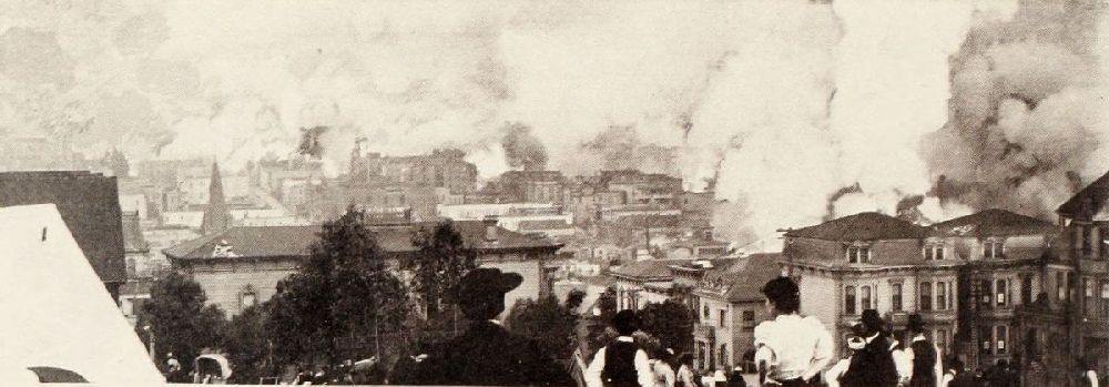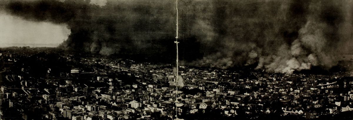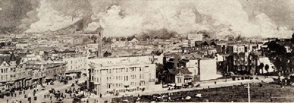 Hardly had the mighty tremblor ceased its gyrations when innumerable fires broke out among the chaotic ruins, having caught from engine furnaces, broken electric wire conduits and spontaneous combustion, fed by the most inflammable of materials and fanned by a stiff breeze from the bay, grew and spread into what shortly became the most stupendous and widespread, as well as awe-inspiring conflagration, which any people of the eighteenth or nineteenth century have ever as yet looked upon or flown from. Had the water mains not have been ruptured, the splendid San Francisco fire department might have been able to cope with these many outbursts of flame at their inception, but deprived of water in the mains, they nobly fought the appalling[Pg iv] flames by pumping water from the bay at as many places as length of hose and their engines’ ability would permit; but their efforts to stay the onrushing, wide-spreading flames proved as a match’s flicker before a whirlwind.