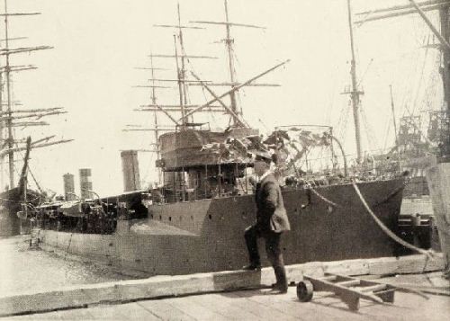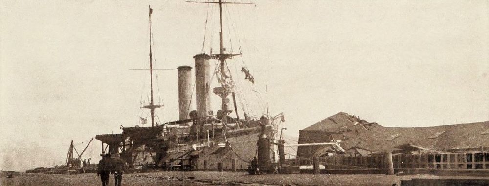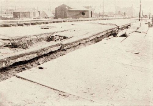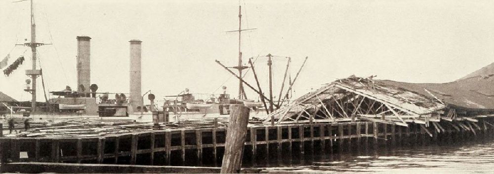 Effects of Shock: Wrecked Wharf No. 9; U. S. Cruiser Chicago Alongside;
