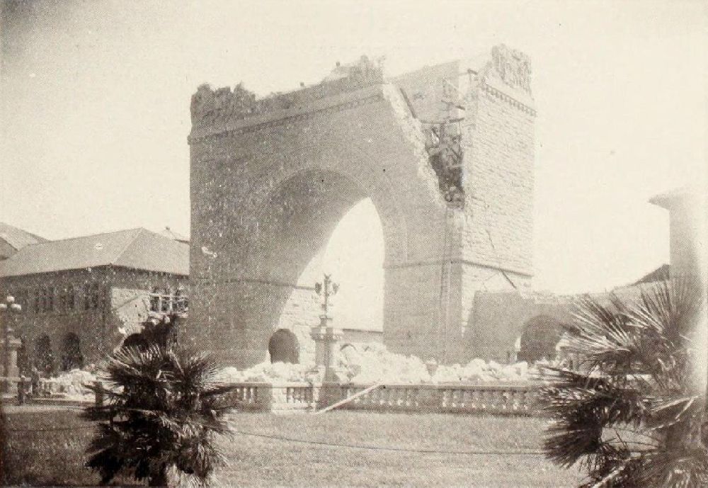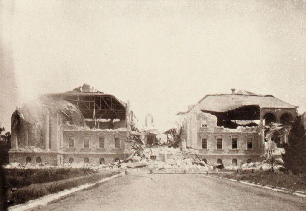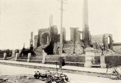 Nor was the City of San Francisco alone in its extremity, for many smaller and populous towns within a radius of seventy-five miles were subjected to the peril of the mighty corkscrew quakings, Santa Rosa being entirely shaken down; Salinas, San Jose, Palo Alto, Santa Cruz, Berkeley, Alameda and Oakland all suffering great property losses and some human lives. The beautiful structures of the Leland Stanford, Jr., University, at Palo Alto, all erected and endowed to a sum in excess of $40,000,000 by the late Senator Leland Stanford and his philanthrophic wife, were almost completely wrecked, including the Memorial Cathedral, which contained the largest and finest collection of mosaic pictures on the Western Hemisphere.