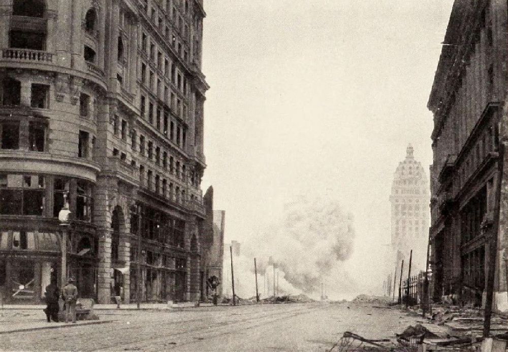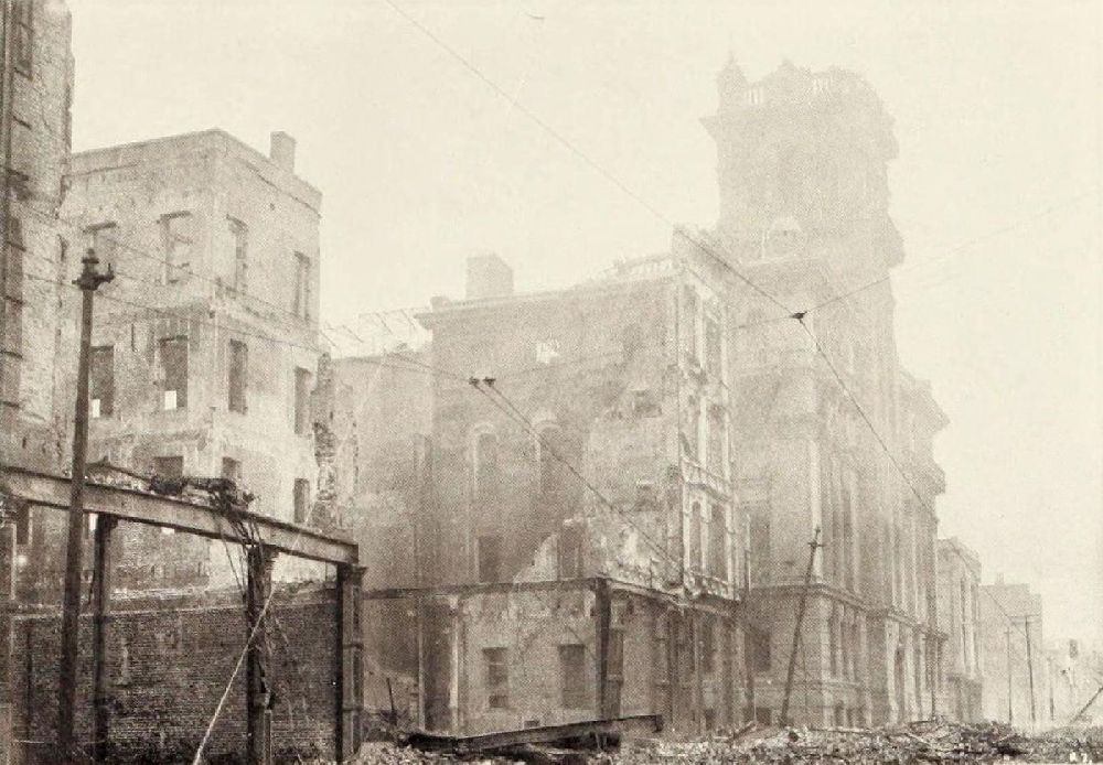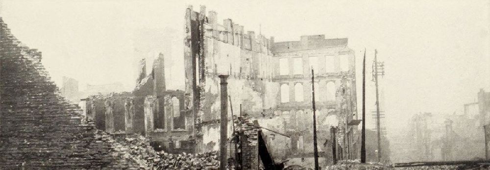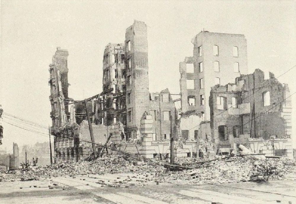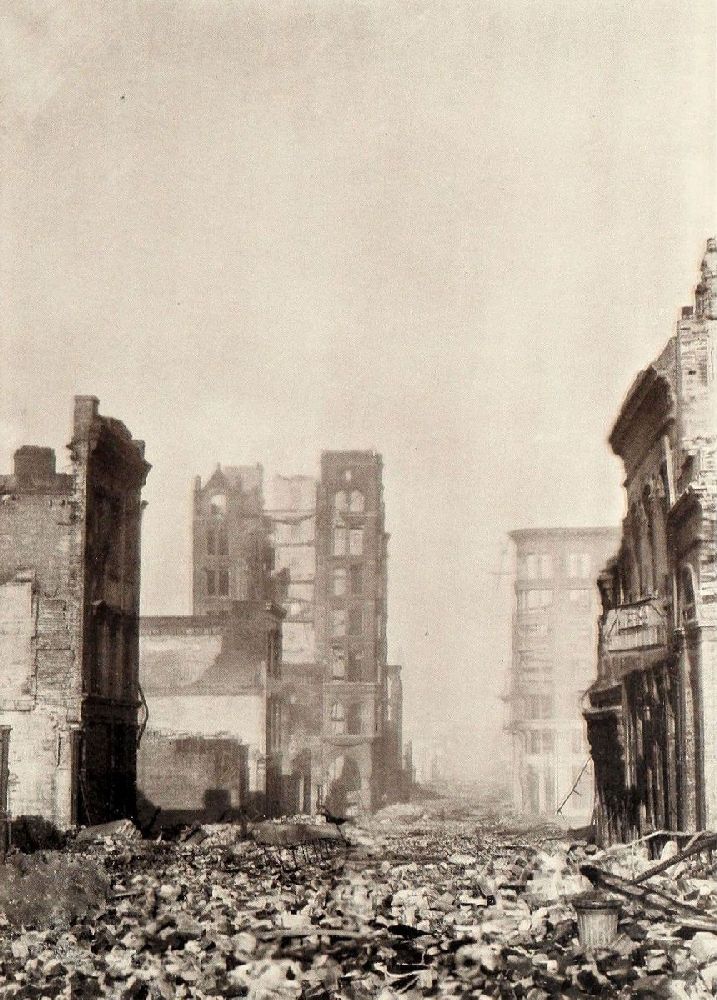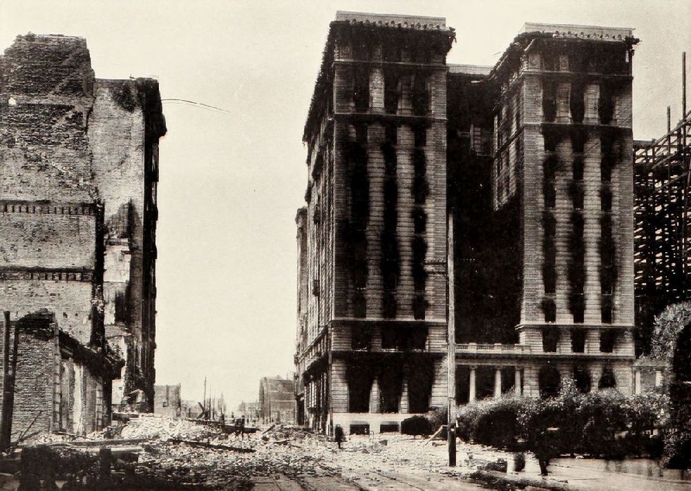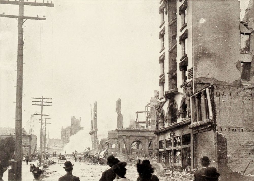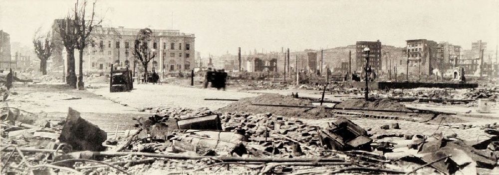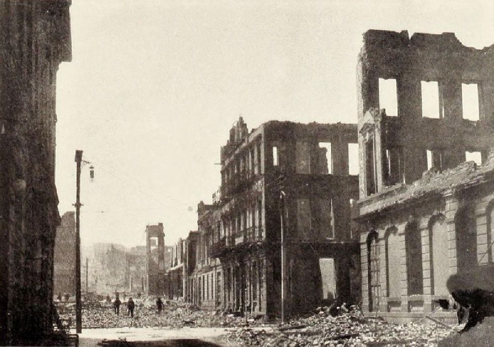 In untiring efforts to stay the flames the army, navy, marine corps and police used artillery fire, gun-cotton, dynamite and rhyolite in back-firing, sacrificing whole blocks of splendid residences and other structures to retard the unquenchable ever-advancing line of fire, which at times extended unbroken for over three miles in length. At last, at the dawn of Saturday, April 21st, after three days and nights of valiant effort, the wind subsided and the flames died down to rise no more; but not until after they had swept the once proud and majestic city from the Ferry building to Van Ness avenue, ruining all the residences on the west side of that broad, stately boulevard, to Twentieth and Guerrero streets in the Mission, and from the waters of San Francisco bay to the Golden Gate itself. Not in all this vast section, measuring over sixteen square miles, did one single habitation escape the shock of the giant tremblor or the all-devouring flames, with but a few exceptions, viz.: the United States Mint, the United States Custom House, the United States Postoffice, which was damaged one-half a million dollars’ worth by made-land sinking away from it, the new unfinished newspaper building of the Chronicle, and the new building of the California Casket Company just erected, but not wood-finished. Every other building, of whatsoever class, kind or construction, was tumbled, crumbled, shaken down, or absolutely gutted by the fierce flames in which granite dissolved to powder and steel beams melted and buckled like a watch’s freed mainspring; where cobble-stones scaled and chipped off and marble slabs disintegrated and became as bone-dust to the touch.