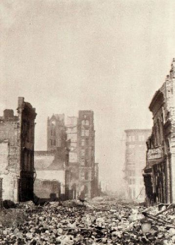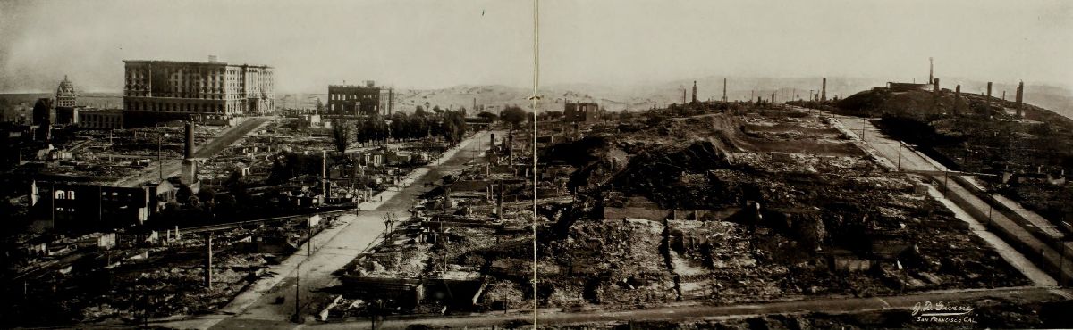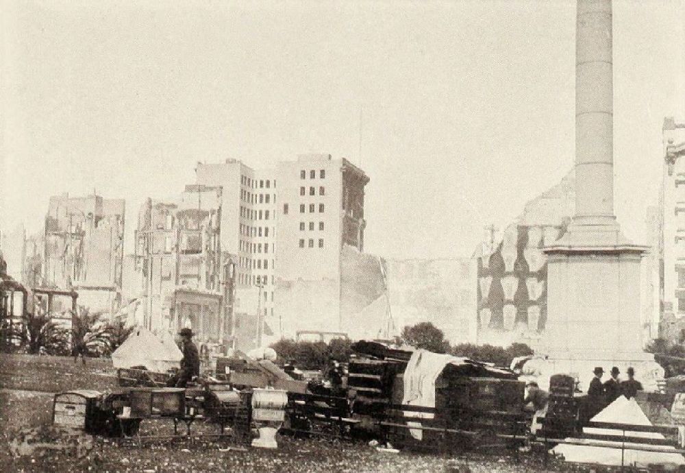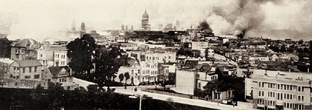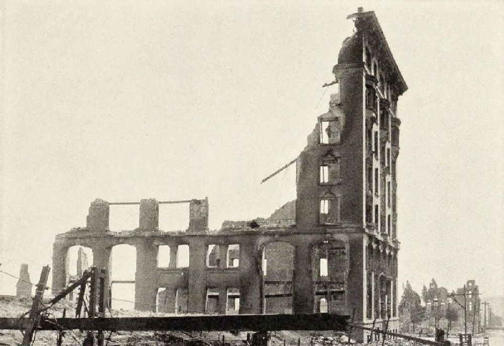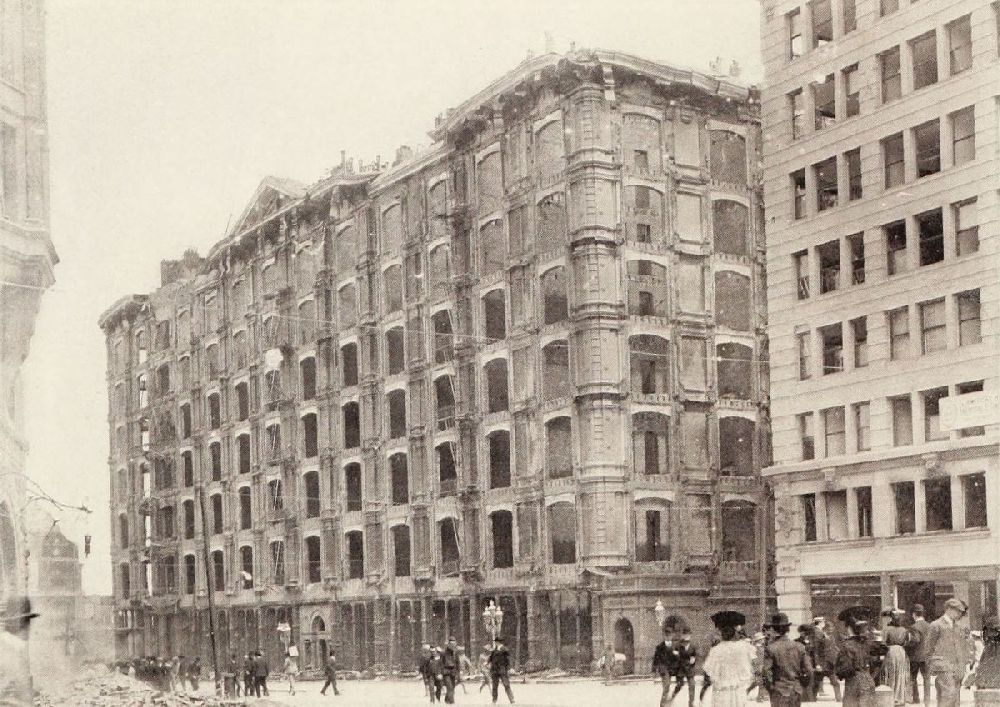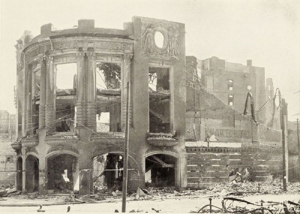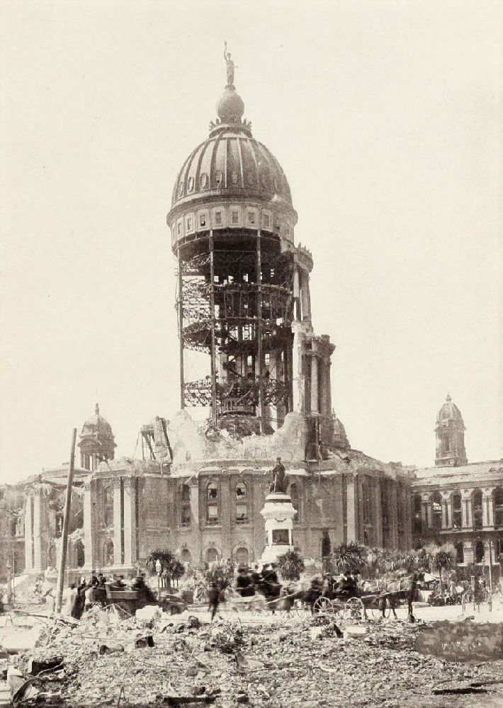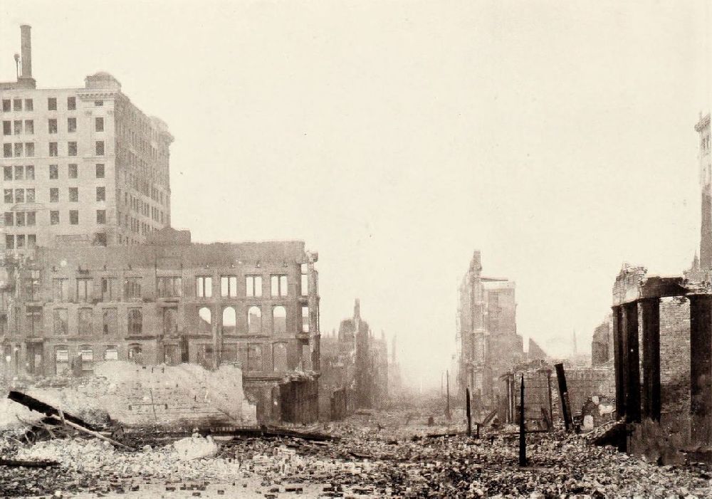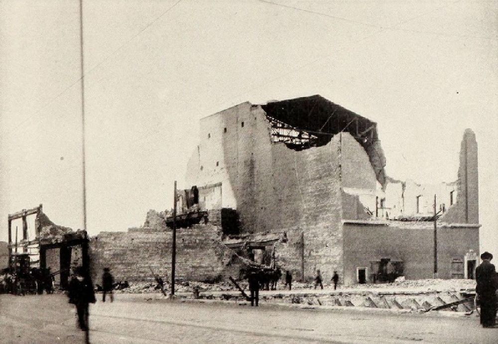 In untiring efforts to stay the flames the army, navy, marine corps and police used artillery fire, gun-cotton, dynamite and rhyolite in back-firing, sacrificing whole blocks of splendid residences and other structures to retard the unquenchable ever-advancing line of fire, which at times extended unbroken for over three miles in length. At last, at the dawn of Saturday, April 21st, after three days and nights of valiant effort, the wind subsided and the flames died down to rise no more; but not until after they had swept the once proud and majestic city from the Ferry building to Van Ness avenue, ruining all the residences on the west side of that broad, stately boulevard, to Twentieth and Guerrero streets in the Mission, and from the waters of San Francisco bay to the Golden Gate itself. Not in all this vast section, measuring over sixteen square miles, did one single habitation escape the shock of the giant tremblor or the all-devouring flames, with but a few exceptions, viz.: the United States Mint, the United States Custom House, the United States Postoffice, which was damaged one-half a million dollars’ worth by made-land sinking away from it, the new unfinished newspaper building of the Chronicle, and the new building of the California Casket Company just erected, but not wood-finished. Every other building, of whatsoever class, kind or construction, was tumbled, crumbled, shaken down, or absolutely gutted by the fierce flames in which granite dissolved to powder and steel beams melted and buckled like a watch’s freed mainspring; where cobble-stones scaled and chipped off and marble slabs disintegrated and became as bone-dust to the touch.