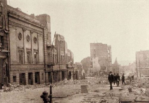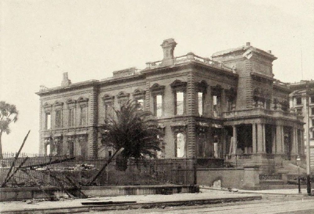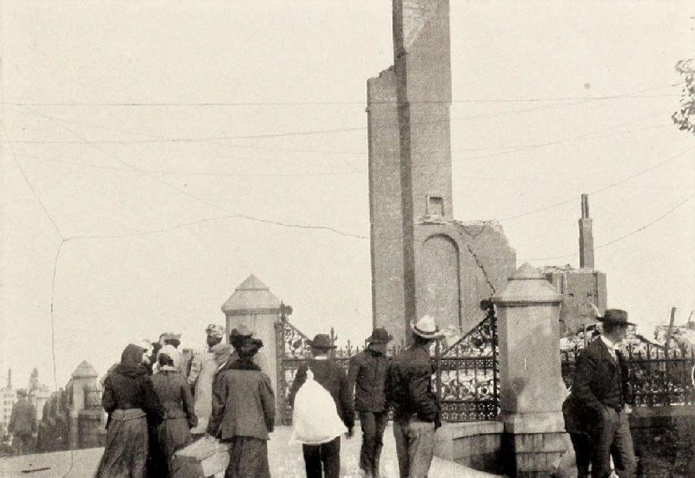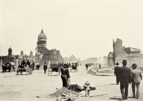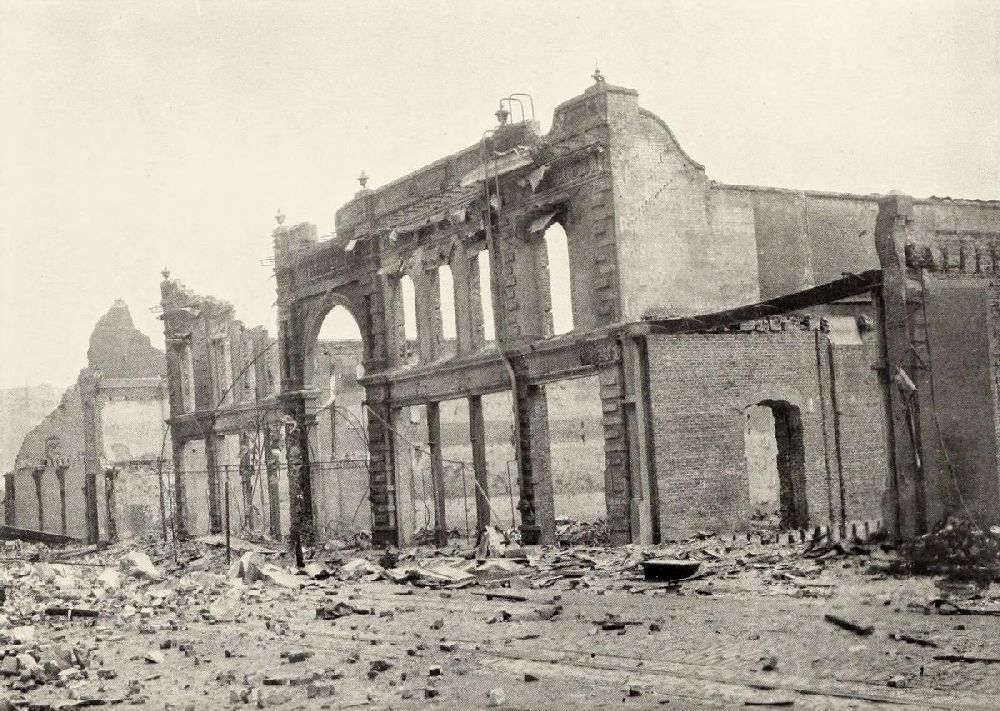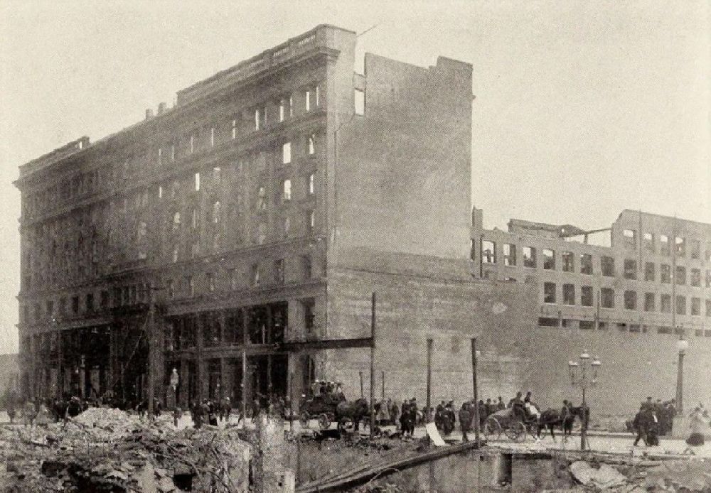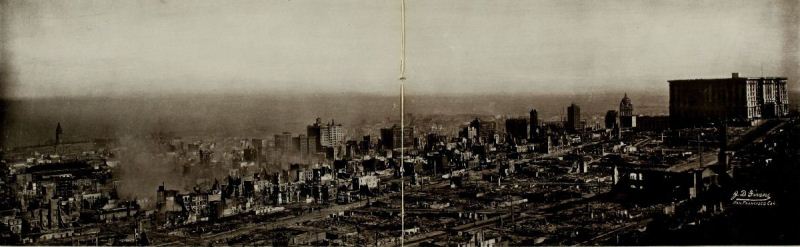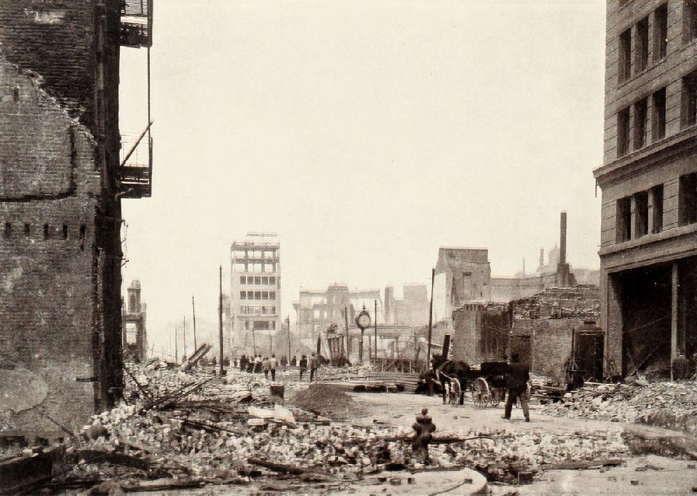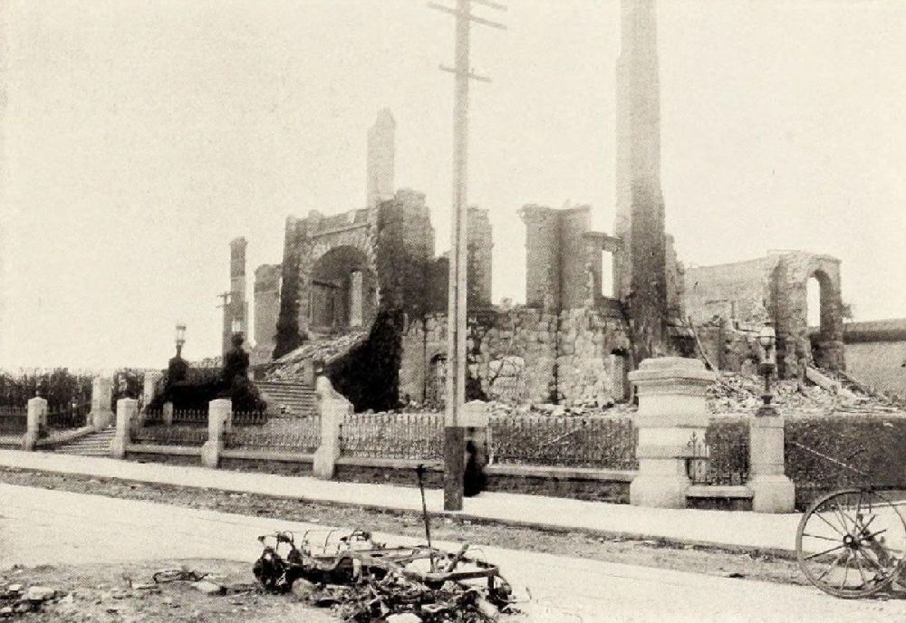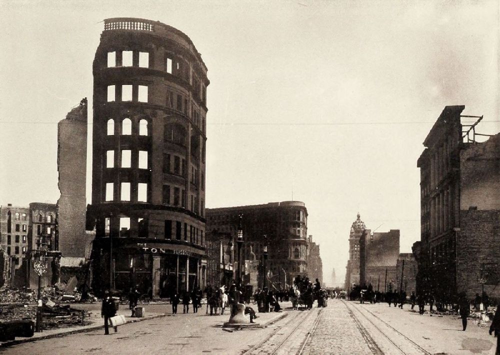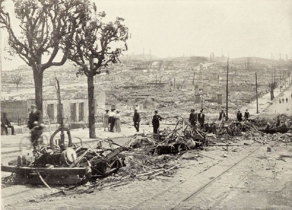 In untiring efforts to stay the flames the army, navy, marine corps and police used artillery fire, gun-cotton, dynamite and rhyolite in back-firing, sacrificing whole blocks of splendid residences and other structures to retard the unquenchable ever-advancing line of fire, which at times extended unbroken for over three miles in length. At last, at the dawn of Saturday, April 21st, after three days and nights of valiant effort, the wind subsided and the flames died down to rise no more; but not until after they had swept the once proud and majestic city from the Ferry building to Van Ness avenue, ruining all the residences on the west side of that broad, stately boulevard, to Twentieth and Guerrero streets in the Mission, and from the waters of San Francisco bay to the Golden Gate itself. Not in all this vast section, measuring over sixteen square miles, did one single habitation escape the shock of the giant tremblor or the all-devouring flames, with but a few exceptions, viz.: the United States Mint, the United States Custom House, the United States Postoffice, which was damaged one-half a million dollars’ worth by made-land sinking away from it, the new unfinished newspaper building of the Chronicle, and the new building of the California Casket Company just erected, but not wood-finished. Every other building, of whatsoever class, kind or construction, was tumbled, crumbled, shaken down, or absolutely gutted by the fierce flames in which granite dissolved to powder and steel beams melted and buckled like a watch’s freed mainspring; where cobble-stones scaled and chipped off and marble slabs disintegrated and became as bone-dust to the touch.