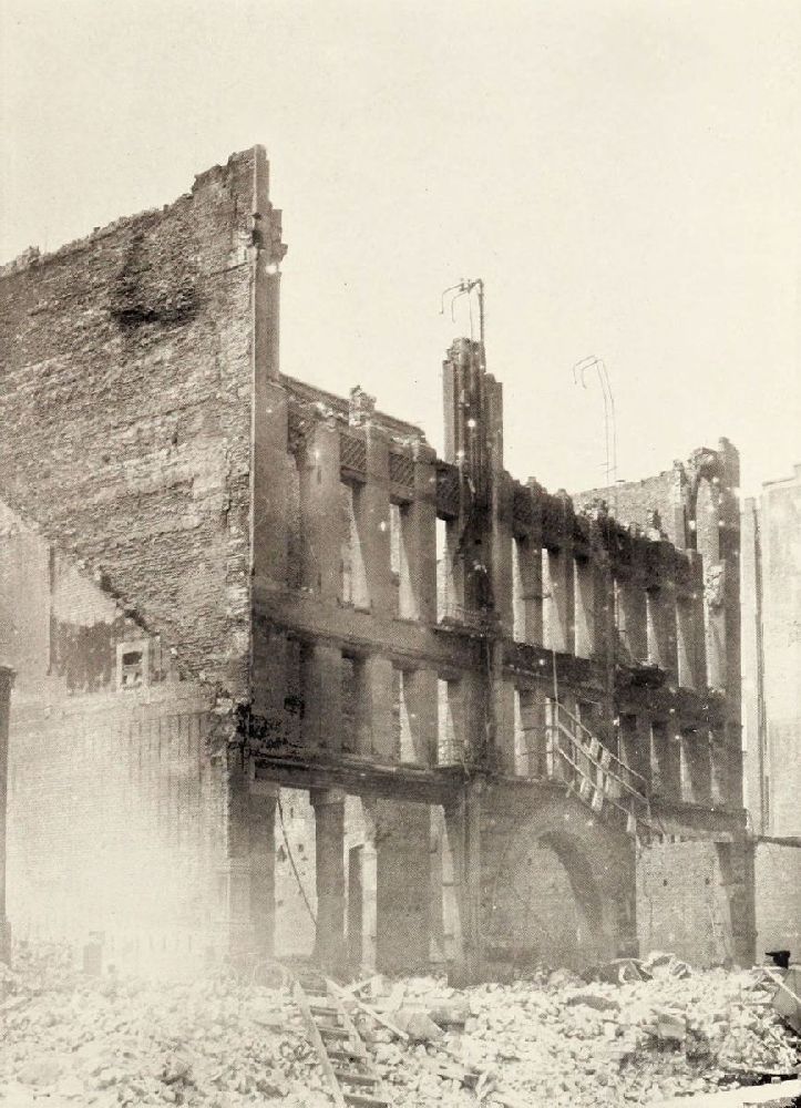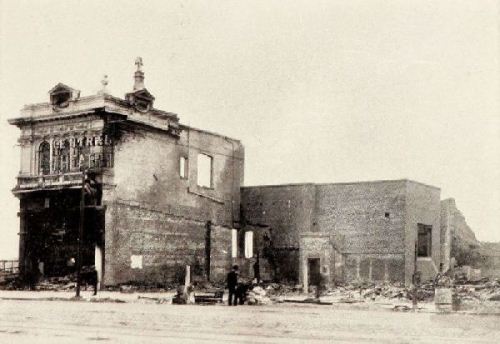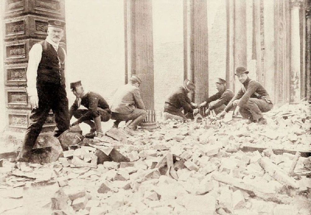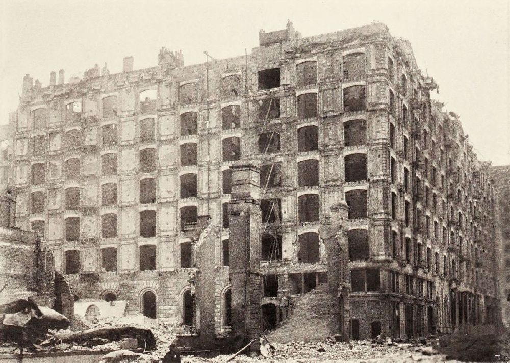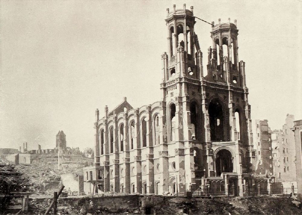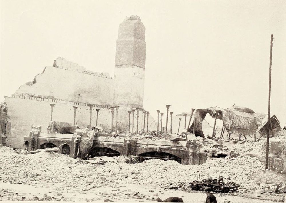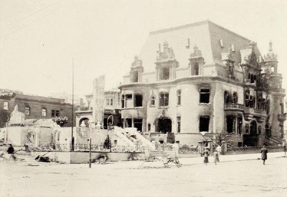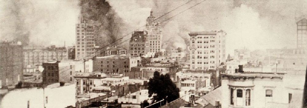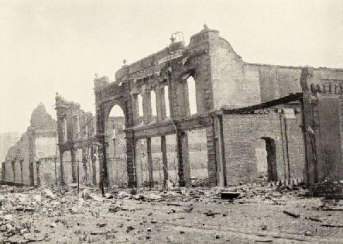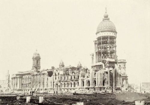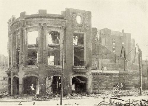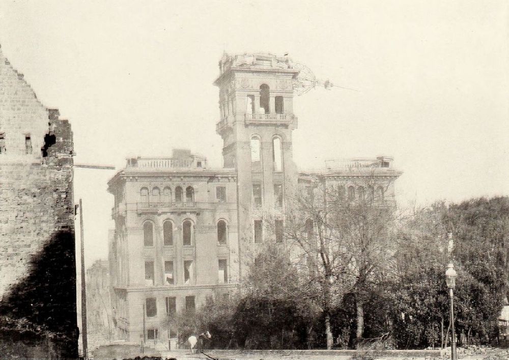 In untiring efforts to stay the flames the army, navy, marine corps and police used artillery fire, gun-cotton, dynamite and rhyolite in back-firing, sacrificing whole blocks of splendid residences and other structures to retard the unquenchable ever-advancing line of fire, which at times extended unbroken for over three miles in length. At last, at the dawn of Saturday, April 21st, after three days and nights of valiant effort, the wind subsided and the flames died down to rise no more; but not until after they had swept the once proud and majestic city from the Ferry building to Van Ness avenue, ruining all the residences on the west side of that broad, stately boulevard, to Twentieth and Guerrero streets in the Mission, and from the waters of San Francisco bay to the Golden Gate itself. Not in all this vast section, measuring over sixteen square miles, did one single habitation escape the shock of the giant tremblor or the all-devouring flames, with but a few exceptions, viz.: the United States Mint, the United States Custom House, the United States Postoffice, which was damaged one-half a million dollars’ worth by made-land sinking away from it, the new unfinished newspaper building of the Chronicle, and the new building of the California Casket Company just erected, but not wood-finished. Every other building, of whatsoever class, kind or construction, was tumbled, crumbled, shaken down, or absolutely gutted by the fierce flames in which granite dissolved to powder and steel beams melted and buckled like a watch’s freed mainspring; where cobble-stones scaled and chipped off and marble slabs disintegrated and became as bone-dust to the touch.