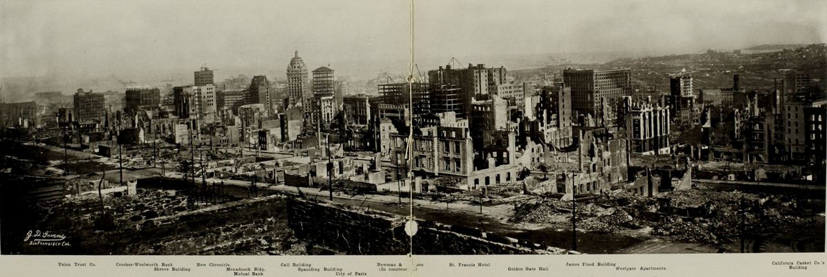 No computer or statistician lives who could accurately arrive at the monetary loss, variously estimated at from three hundred and fifty to four hundred millions of dollars. Nor will the loss of human life ever be known, said to be from fifteen hundred to two thousand; many more are known to have perished in the lodging houses and cheaper hotels located in the district south of Market street, as well as in the poorer districts, of which no returns will or can ever be made; many identities were lost both in and out of unidentified graves.