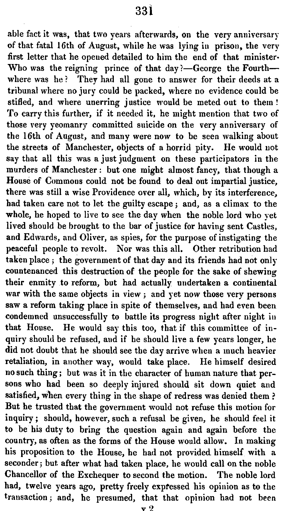 The high price of provisions this year occasioned much distress and discontent, and excited tumults in various parts of the kingdom. Notwithstanding this, ministers attempted to retain every tax that had been imposed during the late war, and appeared perfectly callous to the sufferings of the productive classes. Even the land-tax, of four shillings in the pound, was attempted to be continued, though [41]contrary to all former custom; but the country gentlemen became impatient of this innovation, and contrived to get a bill introduced into the House of Commons, to reduce it to three shillings in the pound. This was carried by a great majority, in spite of all the efforts of the ministry to the contrary! The defeat of the ministers caused a great sensation at the time, as it was the first money-bill in which any ministry had been disappointed since the revolution of 1688! But what can any ministers do against the wishes of a determined people? If the horse knew his own strength, would he submit to the dictation of his rider?