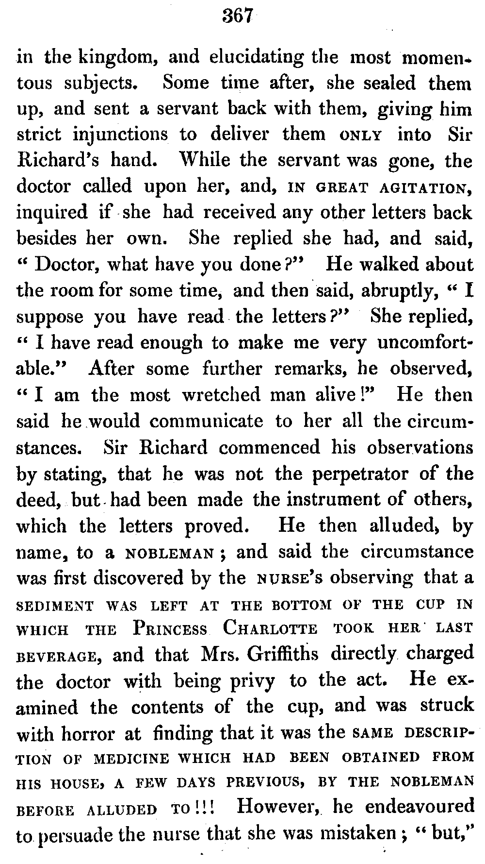 How far the law of Libel (as it now stands) may affect is best to be ascertained by a reference to the declaration of Lord Abingdon, in 1779, and inserted, verbatim, at page 69—1st vol. of this "Secret History." The following Pages are intended as a benefit, not to do injury. If the facts could not have been maintained proper methods ought to have been adopted to have caused the most minute enquiry and investigation upon the subject. Many an Arrow has been shot, and innumerable suspicions entertained from what motive, and by whose hand the bow was drawn, yet here all mystery ceases, and an open avowal is made:—Would to Heaven for the honor of human nature that the subjoined documents were falsehoods and calumniations invented for the purpose of maligning character, or for personal resentments—but the unusual corroboration of events, places, times, and persons, will not admit the probability. In the affair of the ever lamented Death of the Princess Charlotte, the three important Letters commencing at page 369, vol. 1st, are of essential importance, and deserve the most grave and deliberate enquiry—for the first time they now appear in print. The subjects connected with the Royal Mother are also of deep interest. The conduct of the English Government towards Napoleon is [vi]introduced, to give a true and impartial view of the reasons which dictated such arbitrary and unjust measures enforced against that Great Man, and which will ever remain a blot upon the British Nation. These unhandsome derelictions from honorable conduct could alone be expressed by those who were well informed upon private subjects. Respect for the illustrious Dead has materially encouraged the inclination to give publicity to scenes, which were as revolting in themselves as they were cruel and most heart-rending to the Victims: throughout the whole, it is quite apparent that certain Persons were obnoxious to the Ruling Authorities, and the sequel will prove, that the extinction of such Persons was resolved upon, let the means and measures to obtain that object be what they might. During this period we find those who had long been opposed in Political sentiments, to all appearance perfectly reconciled, and adhering to that party from whom they might expect the greatest honors and advancement in the State. We need only refer as proofs for this, to the late "Spencer Percival," and "George Canning"—who to obtain preferment joined the confederations formed against an unprotected Princess, and yet who previously had been the most strenuous defenders of the same Lady's cause.—Well may it be observed that Vanity is too powerful,