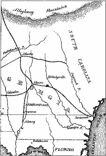 Andersonville—a name which has been stamped so deeply by cruelty into the pages of American history—is one of those miserable little hamlets, of a score of scattered and dilapidated farm-houses, which relieve the monotony of the wide and dreary level of sand plains, which, covered with immense forests, interspersed with fens, marshes, corn and cotton fields, stretch away, in unbroken surface, from Macon down to the Florida shores. The plantations, which were tilled by slave labor, are almost concealed in the recesses of the forests, so thickly wooded is the country. Here and there only, where the savannas are of unusual fertility, do the cleared lands [Pg 17]give a wide and extended view of the landscape, but the primeval pines everywhere hide the distant horizon.