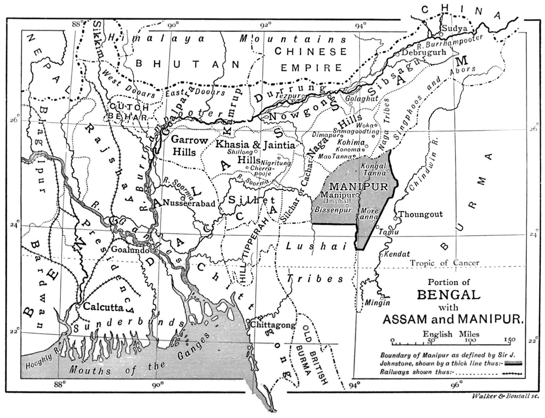Konoma evacuated—Journey to Suchema for provisions and ammunition, and return—We march to Suchema with General—Visit Manipur—Very ill—Meet Sir Steuart Bayley in Cachar—His visit to Manipur—Grand reception—Star of India—Chussad attack on Chingsow—March to Kohima and back—Reflections on Maharajah’s services—Naga Hills campaign overshadowed by Afghan war 175 [xiv]