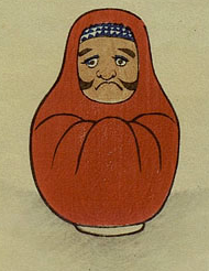 Consta que, por voluntaria desistencia das ephemeras alegrias terreaes, Darumá votou-se a passar a vida de joelhos sobre o solo pedregoso, absorto em contemplaçöes mysticas, sem mesmo permittir-se o simples regalo de dormir. Tantos annos permaneceu de tal maneira, que as pernas se lhe gastaram, claro está; e é assim, sem pernas, só com a cabeça e com o tronco, envolto n'um manto carmezim, que ainda hoje é figurado. A imagem tronou-se querida e popular entre esta boa gente japoneza; é mesmo um brinquedo corriqueiro entre as mäositas das creanças,—os santos e os meninos vivem sempre em boa companhia;—lembrando o tal brinquedo o nosso frade de sabugo, pela teima em voltar, por mais voltas que lhe dêem, á sua postura habitual. Deve ainda saber-se que Darumá tem dado assumpto, desde remotos tempos até hoje, a pintores da mais alta valia; Hokusai foi um d'elles, pintando um famoso Darumá sobre uma folha de papel de cerca de duzentos metros quadrados de grandeza, empregando oitenta litros de tinta no desenho e servindo-se de cinco vassouras á laia de pinceis; estendida a tela sobre o campo, [10] no telhado de um templo a turba admirava a obra e applaudia o mestre.