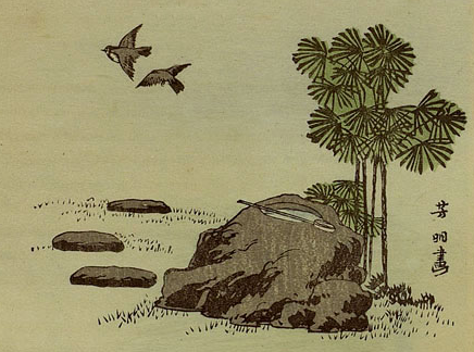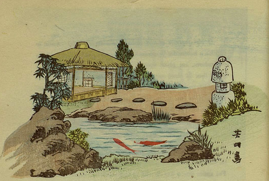 Tudo foi regulamentado e comporta um preceito, que näo é licito esquecer. Non tempos aureos do chá-no-yu o pavilhäo que recebia os hospedes era construido n'um jardin e obedecia a uma architectura inconfundivel. No seu arranjo interno, para a côr das paredes, para a disposiçäo de luz, para o numero das esteiras, para a jarra com flores ou com um ramo de arvore, havia praxes a seguir; o kakemono (quadro suspenso da parede) devia representar uma paizagem que fôsse impressionar a pupilla com carinho; ou antes uma simples sentença escripta por um pincel de mestre calligraphico, pois nada commove tanto a aguda sensibilidate d'esta gente como os seus caractéres de estranha construcçäo, cada um equivalendo já a uma synthese de ideas e predispondo, pela sentida contemplaçäo—ora por uma desenvoltura de traço, ora por uma ondulaçäo de curva,—ao vago discorrer da alma sonhadora... [30]