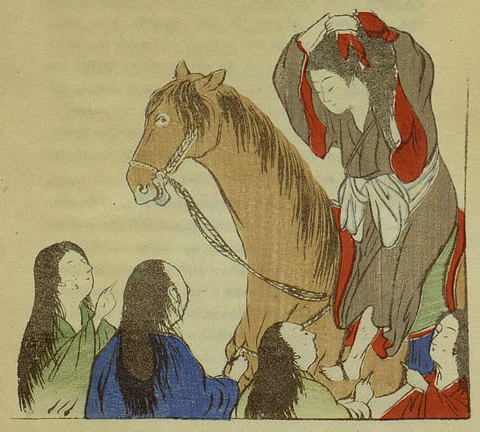 Vem agora a proposito narrar um pormenor curioso, que é de toda a tragedia o que mais me enternece. A misera seguia, conforme o estylo, pelas ruas populosas, amarrada ao dorso de uma besta, para ignominia propria e para licçäo do povo; mais tarde seria executada. A meio da jornada expiatoria, os seus longos cabellos soltos, como até entäo eram usados, cahiam-lhe em desalinho sobre a fronte, cheios da poeira dos caminhos, escorrendo de suor, fustigando-lhe as faces. Entäo, ou porque quizesse poupar-se a um tormento a mais, ou—quem sabe?—por um resto de garridice deminia, viram-n'a rasgar com [41] os bellos dedos tremulos um pedaço da seda carmezim do forro do vestido, com quem amarrou junto á nuca, erguendo os braços, esses pobres cabellos... A idea pareceu graciosa ás raparigas, que se iam juntando em grupos curiosos para observarem o cortejo; e desde entäo as japonezas começaram de usar aquelle enfeite, que persiste até hoje e a que chamam kikidashi—litteralmente: farrapo—em memoria de O-Hichi, a triste namorada de Kichisa...
