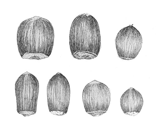 This work has not been written for the edification, or the special approbation, of scientific botanists, but for those who, in the opinion of the writer, are most likely to profit by a treatise of this kind. Unfamiliar terms have been omitted wherever simple common words would answer equally as well in conveying the intended information. There being no work of this kind published in this country that would serve as a guide, I have been compelled to formulate a plan of my own,[iv] and to describe all the newer varieties from the best specimens obtainable, and these may not, in all cases, have been perfect. Under such circumstances, this work must necessarily be incomplete, and especially where the possessors of claimed-to-be new and valuable varieties have either refused or failed to give any information in regard to them. On the contrary, however, I must acknowledge my indebtedness to many correspondents, who have so generously placed specimens of both trees and nuts of rare new varieties in my hands for testing and describing, as well as assisting me in tracing their history and origin.
