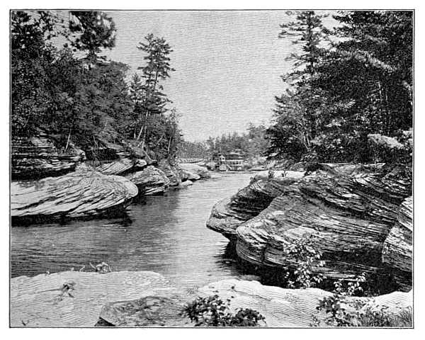 The broad valley of the Wisconsin presents a far different appearance from that of the peacefully flowing Upper Fox, with its outlying marshes of reeds, and its numerous lakes. The Wisconsin, or Meskousing, as Marquette writes it, is flanked by ranges of bold, heavily wooded bluffs, which are furrowed with romantic ravines, while the channel is, at low water, studded with islands and sand bars, and in times of flood spreads to a great width. Marquette himself describes it thus: "It is very broad, with a sandy bottom, forming many shallows, which render navigation very difficult. It is full of vine-clad islets. On the banks appear fertile lands diversified with wood, prairie, and hill. Here you find oaks, walnut, whitewood, and another kind of tree with branches armed with long thorns. We saw no small game or fish, but deer and moose in considerable numbers." About ninety miles below Portage, they thought that they discovered an iron mine.