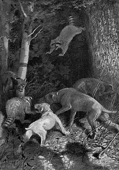 This is not from fear, for no animal, except perhaps the wolverine—who is a terrible beast—is more careless of danger or faces it with such coolness and courage when it appears. Of a dog or two he takes little heed. If he hear them on his trail, he generally climbs a tree to get out of the way; for your dog, unlike his wild brother, the wolf, is a meddlesome fellow and must needs be worrying everything; and Mooweesuk, like most other wild creatures, loves peace, hunts only when hungry, and would always prefer to avoid a row if possible. When caught on the ground, or cornered, or roused to action by a sudden attack, he backs up against the nearest tree or stone to keep his enemies from getting at him from behind, and then fights till he is dead or till none of his enemies are left to bother him, when he goes quietly on his way again. No matter how great the odds or how terribly he is punished, I have never seen a coon lose his nerve or turn his back to run away. If the dogs be many and he is near a pond or river, he will lead them into deep water, where he is at[39] home, and then swimming rapidly in circles will close with them one by one and put them out of the fight most effectively. His method here seldom varies. He will whirl in suddenly on the dog that he has singled out, grip him about the neck with one arm, saw away at his head with his powerful teeth, at the same time slashing him across the eyes with his free claws, and then pile his weight on the dog's head to sink him under and drown all the rest of the fight out of him. That is generally enough for one dog; and Mooweesuk, without a scratch and with his temper cool as ice, will whirl like a flash upon his next victim.
