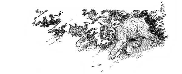 The mother came out first and sagged away backwards down the tree, swinging her head from side to side to look down and see how far yet, in true bear fashion. The four little ones followed her, clawing and whining their way to the bottom—all but one, who when half-way down turned and jumped,[21] [23]landing on his mother's soft back to save himself trouble. Then she led the way to the doorway among the rocks, and the young followed in single file, winding about on her trail, stopping and sniffing when she did, and imitating her every action, just as young bear cubs do when roaming about the woods.