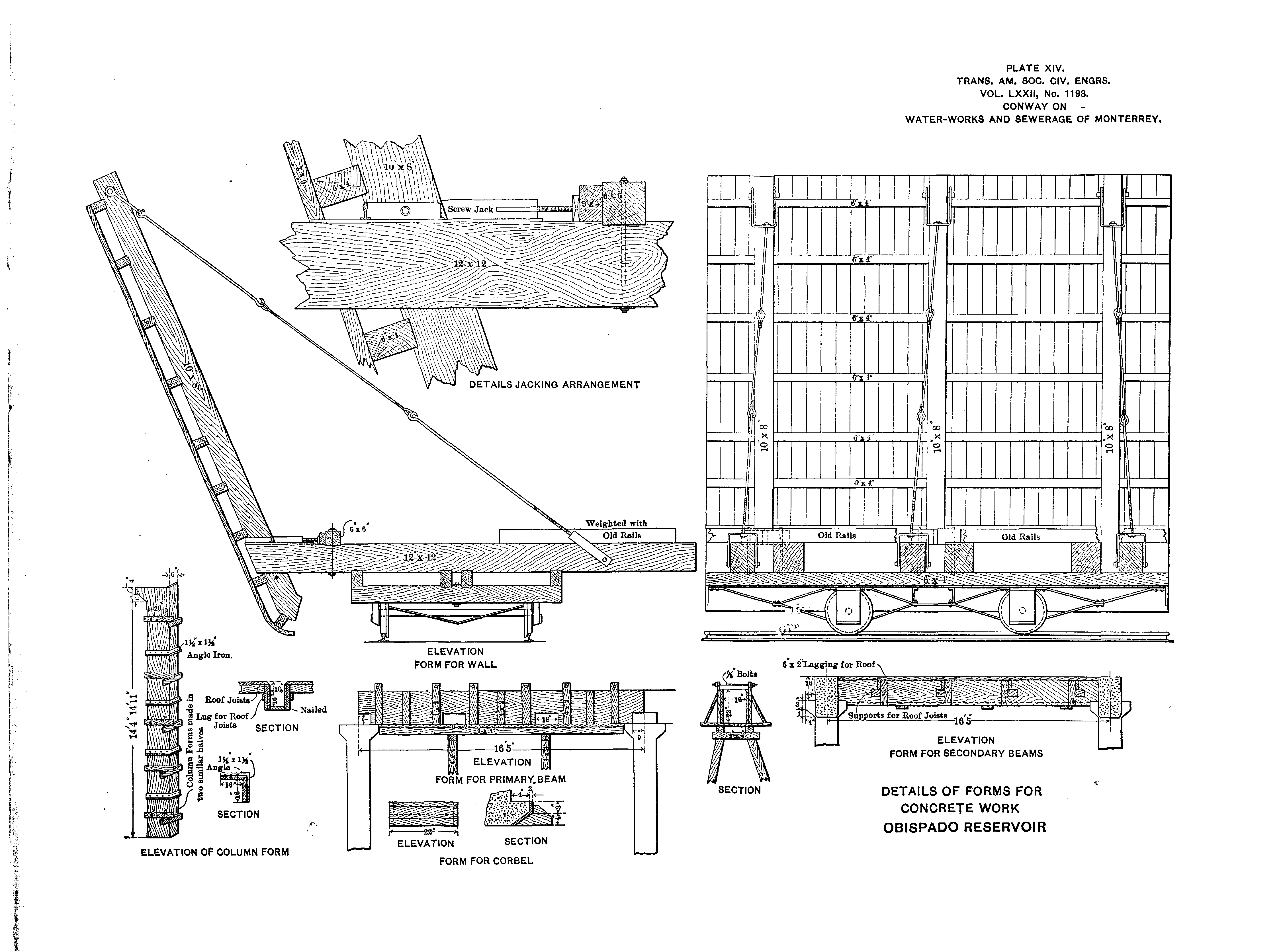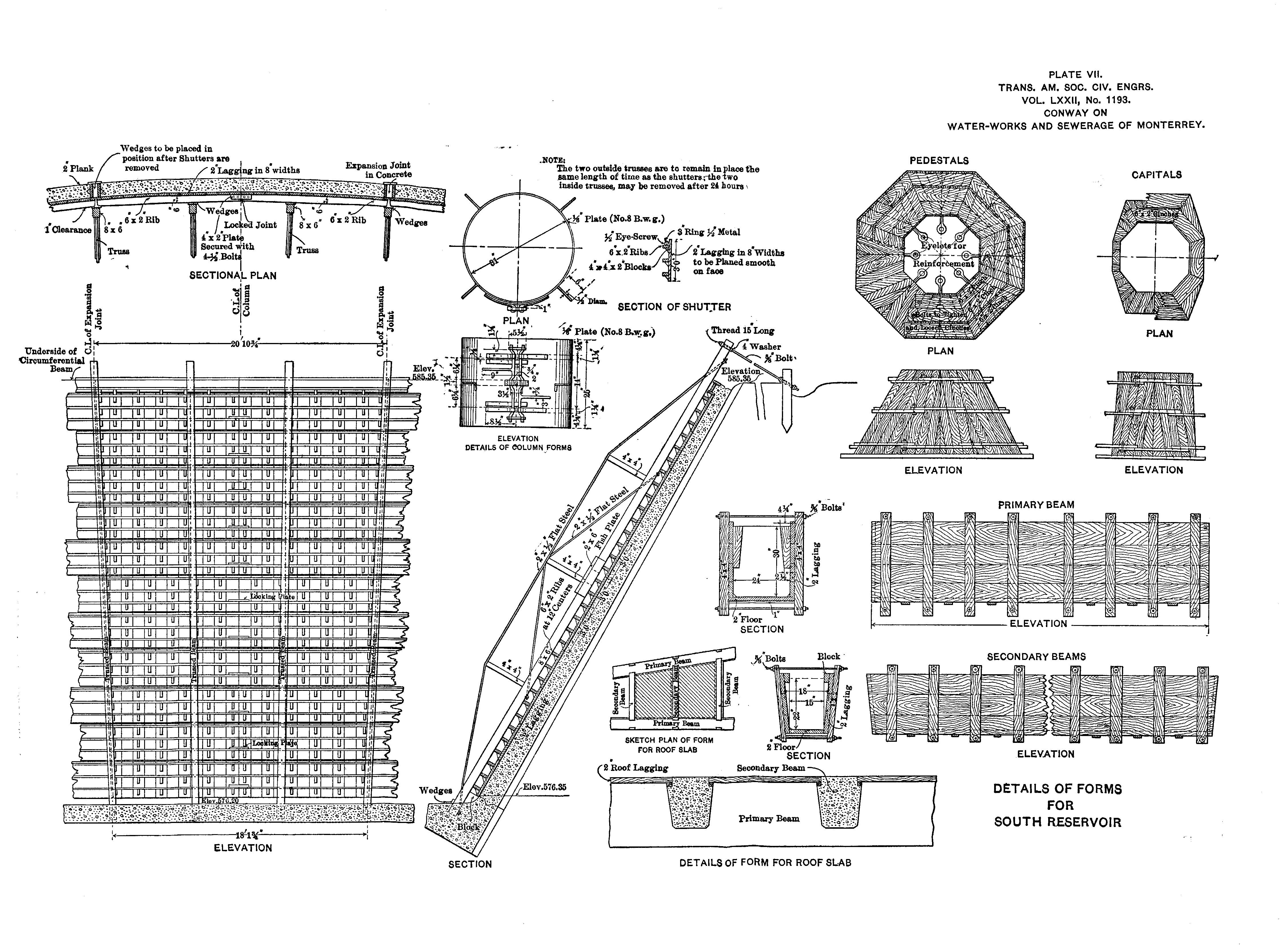 Sand and Rock.—One of the chief difficulties in connection with the construction work in its initial stages was in procuring satisfactory sand for the concrete. An investigation of the quality of all the available sands in the neighborhood of Monterrey resulted in the decision to use a manufactured sand obtained from the calcareous shales in the foot-hills opposite the city, on the south side, and near the site of one of the proposed reservoirs. A quarry was opened, and the raw material was delivered by a gravity plane to a crushing plant, 230 m. from the quarry and at a level about 50 m. lower.