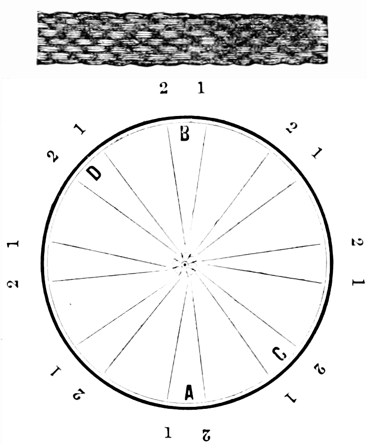 Take sixteen strands, seventy-five hairs in a strand, and place on the table like pattern. Commence at A take Nos. 1 and 2, lift across the table to B, and lay No. 1 outside of No. 4, and lay No. 2 between Nos. 1 and 2, and bring back Nos. 1 and 2 from B to A, and lay No. 1 outside of No. 4, and No. 2 outside of No. 1 at A; then go to C and take Nos. 1 and 2, lift over table to D and lay No. 1 outside of No. 4, and lay No. 2 between Nos. 1 and 2, and bring back Nos. 1 and 2 from C, and lay No. 1 outside of No. 4, and No. 2 outside of No. 1 at C; then go to B and change the same, and so on around the table to the right until the braid is finished.