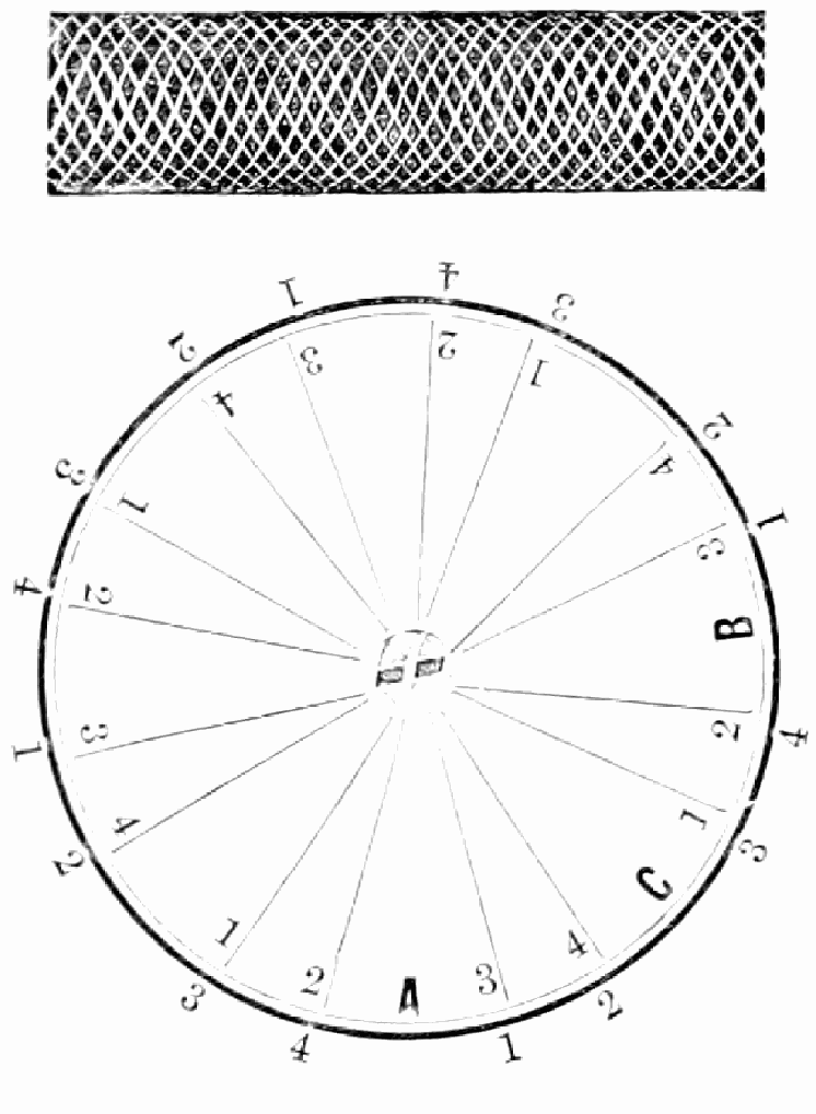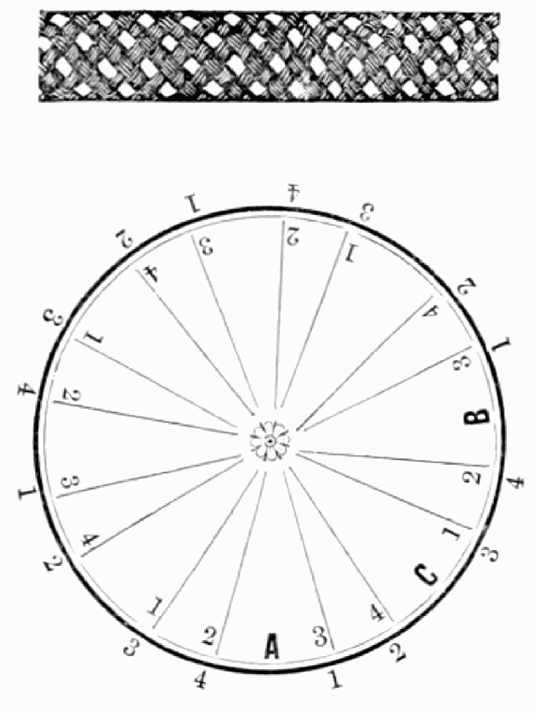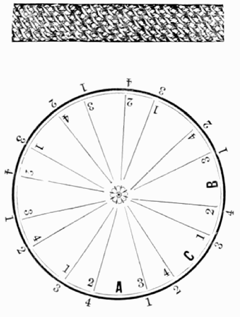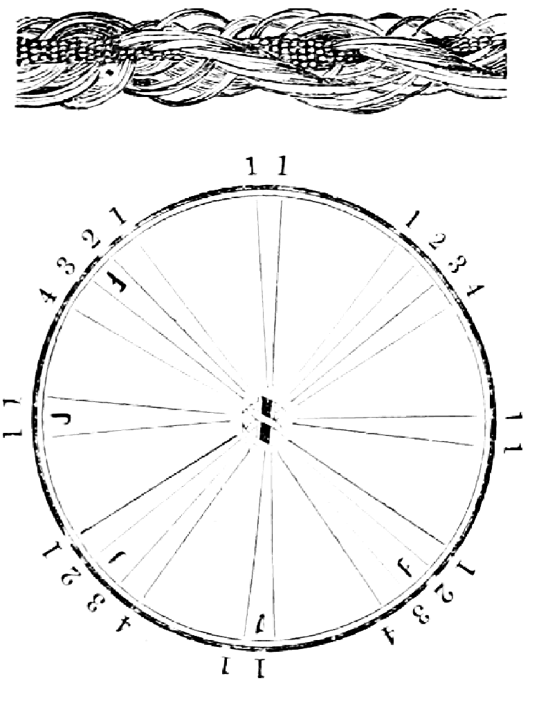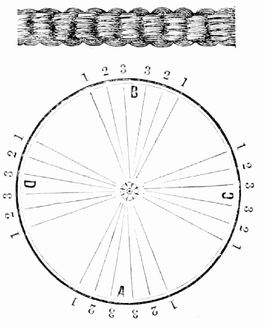 Take sixteen strands, eighty hairs in a strand, and lay on table like pattern. Commence at A and B—take No. 1 at A in left hand and No. 1 at B in right hand, swing around table to the left, and change places with them; then take No. 7 at B in right hand and No. 7 at A in left hand, and swing around the table to the right and change places with them; then take No. 5 at A in right hand and No. 5 at B in left hand, and swing around the table to the left, and change places as before; then take No. 8 at A in right hand and No. 8 at B in left hand and swing around table to the left and change as before; then take No. 6 at A in left hand, and No. 6 at B in right hand and swing around table to the right and change as before; then take No. 4 at A in right hand and No. 4 at B in left hand, and swing around table to the left and change as before; then take No. 7 at A in right hand and No. 7 at B in left hand, swing around table to the left and change as before, then take No. 5 at A in left hand and No. 5 at B in right hand, swing around table to the right and change as before; then take No. 3 at A in right hand and No. 3 at B in left hand and swing around table to the left and change as before; then take No. 6 at A in right hand and No. 6 at B in left hand and swing around table to the left and change as before; then take No. 4 at A in left hand and No. 4 at[32] B in right hand and swing around table to the right and change as before; then take No. 2 at A in right hand and No. 2 at B in left hand and swing around table to the left and change as before; then take No. 5 at A in right hand and No. 5 at B in left hand and swing around table to the left and change as before, then take No. 3 at A in left hand and No. 3 at B in right hand, and swing around table to the right and change as before. Then commence at A as at first.