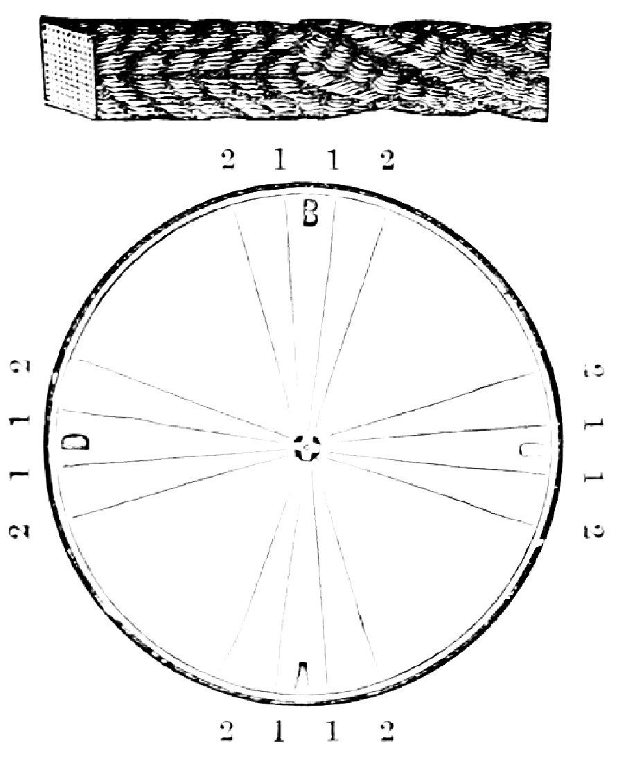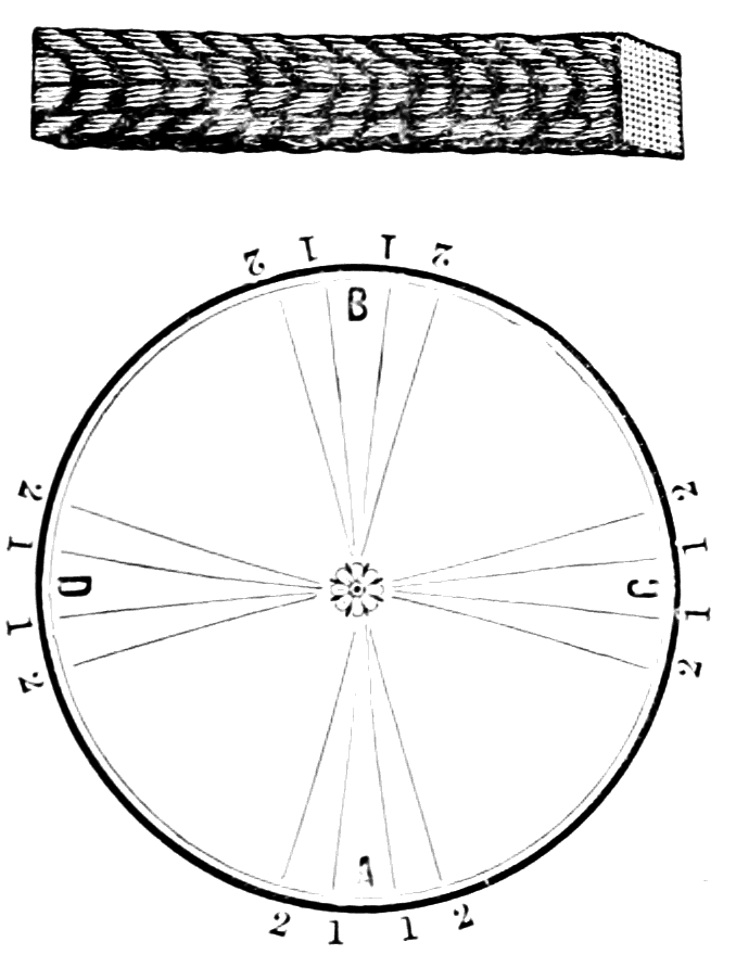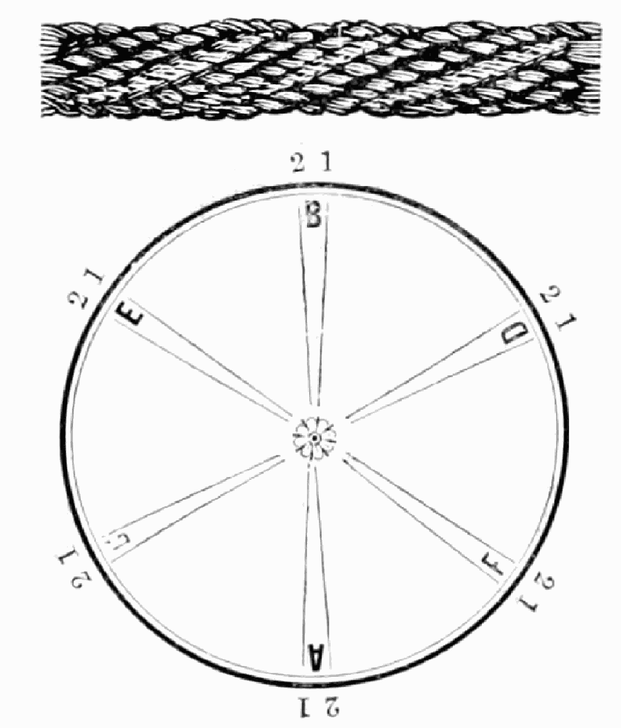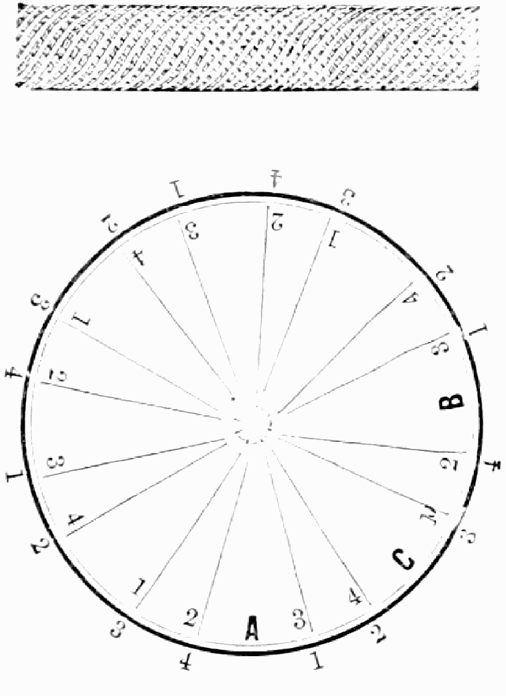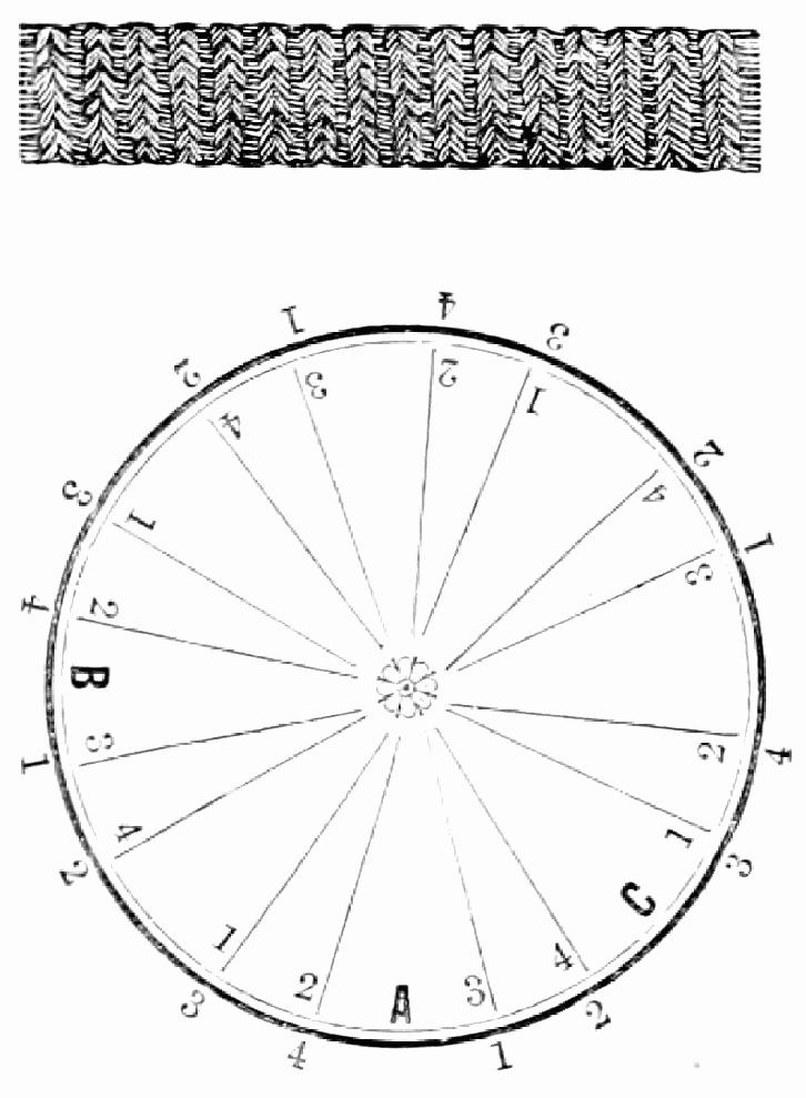 Take sixteen strands, eighty hairs in a strand, and lay on table like pattern. Commence at A and B—take No. 1 at A in left hand and No. 1 at B in right hand, swing around table to the left, and change places with them; then take No. 7 at B in right hand and No. 7 at A in left hand, and swing around the table to the right and change places with them; then take No. 5 at A in right hand and No. 5 at B in left hand, and swing around the table to the left, and change places as before; then take No. 8 at A in right hand and No. 8 at B in left hand and swing around table to the left and change as before; then take No. 6 at A in left hand, and No. 6 at B in right hand and swing around table to the right and change as before; then take No. 4 at A in right hand and No. 4 at B in left hand, and swing around table to the left and change as before; then take No. 7 at A in right hand and No. 7 at B in left hand, swing around table to the left and change as before, then take No. 5 at A in left hand and No. 5 at B in right hand, swing around table to the right and change as before; then take No. 3 at A in right hand and No. 3 at B in left hand and swing around table to the left and change as before; then take No. 6 at A in right hand and No. 6 at B in left hand and swing around table to the left and change as before; then take No. 4 at A in left hand and No. 4 at[32] B in right hand and swing around table to the right and change as before; then take No. 2 at A in right hand and No. 2 at B in left hand and swing around table to the left and change as before; then take No. 5 at A in right hand and No. 5 at B in left hand and swing around table to the left and change as before, then take No. 3 at A in left hand and No. 3 at B in right hand, and swing around table to the right and change as before. Then commence at A as at first.