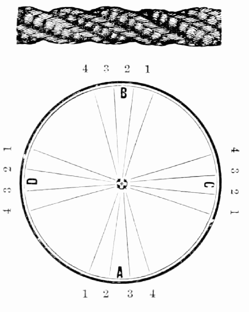 Take sixteen strands, eighty hairs in a strand, and place them on the table like pattern. Commence at A and B, take No. 1 at A in right hand and No. 1 at B in left hand, and swing them around to the right and change places with them; then take No. 1 at C in right hand and No. 1 at D in left hand, and swing around table to the right and change places as before; then take No. 2 at B in right hand and No. 2 at A in left hand and swing to the right and change as before; then take No. 2 at D in right hand and No. 2 at C in left hand and swing to the right and change as before; then take No. 3 at A in right hand and No. 3 at B in left hand and change as before; then take No. 3 at C in right hand and No. 3 at D in left hand and change as before; then take No. 4 at B in right hand and No. 4 at A in left hand and change as before then take No. 4 at D in right hand and No. 4 at C in left hand and change as before. Then commence at A as at first and repeat till the braid is finished.