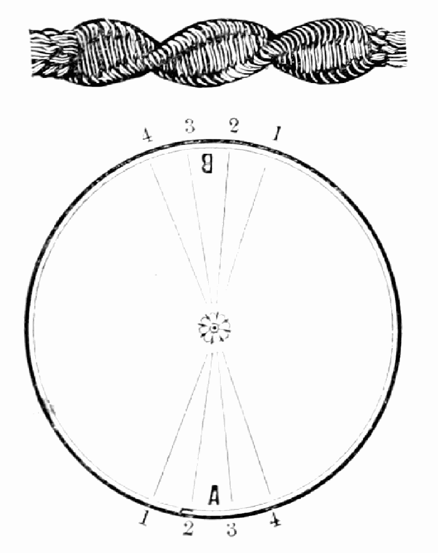 Take any number of strands that can be divided by two, eighty hairs in a strand, twenty strands for usual size, place on table like pattern. Commencing, take No. 1 at A in right hand and No. 1 at B in left hand, and swing around the table to the right, and lay the one in right hand at No. 1 at B, and the one in left hand at No. 1 at A; then bring back No. 2 at B with right hand, and No. 2 at A in left hand, to the left, then take No. 3 and swing to the right, then No. 4 and swing to the left, so on, round first to the right then to the left, with every number of strands till you get to No. 1; then commence as at first, and so on till the chain is as long as required.