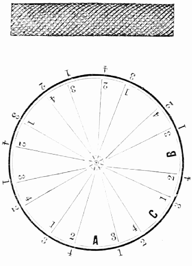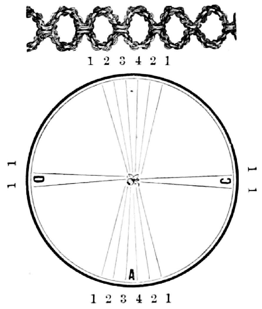 Take thirty-two strands with twelve hairs in a strand, or any number that can be divided by four, and sixty strands for usual size, and place them on table like pattern. Have every alternate two strands of black hair, and the others of light hair. Commence at A, taking two strands of light hair in left hand, Nos. 1 and 2, and take two strands of black hair in right hand, Nos. 3 and 4, and cross No. 2 (light) over No. 3 (dark), then No. 1 (light) under No. 3 (dark), then No. 4 (dark) over Nos. 1 and 2 (light); so on around the table to the right until you get to A; then commence and work back to the left by taking light hair in left hand and dark hair in right hand, as before, and put No. 3 (dark) over No. 2 (light), and No. 4 (dark) under No. 2 (light), and No. 1 (light) over Nos. 3 and 4 (dark), so on around the table till you get to A; then commence as at first, so on, braiding first one way around the table then the other till you have the chain completed.