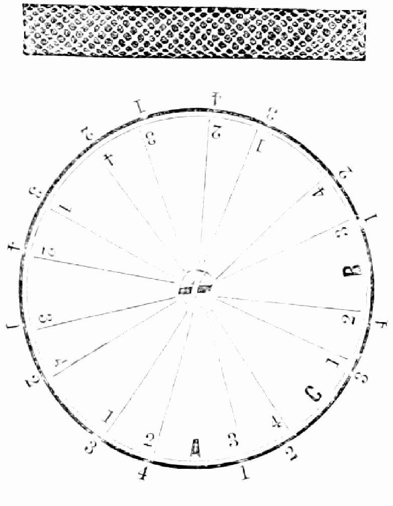 Take twenty-four strands, sixty hairs in a strand, and place on table like pattern. Commence at A and B: take Nos. 1 at A, and lift them across the table, and lay the one in left hand between Nos. 1 at B, and the one in right hand on the outside of Nos. 1 at B, and bring back the Nos. 1 from B to A. Then pass round the table to the right, and change (in the same manner) successively, the Nos. 3, 5, 6, 2, 4, 6, 2, 4, 5, 1, 3 and 5; then commence at A with Nos. 1, as at first, and repeat until the braid is finished.