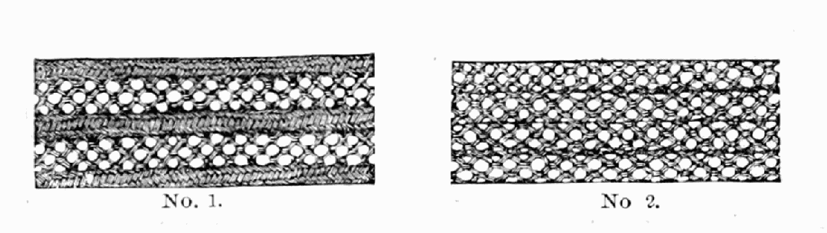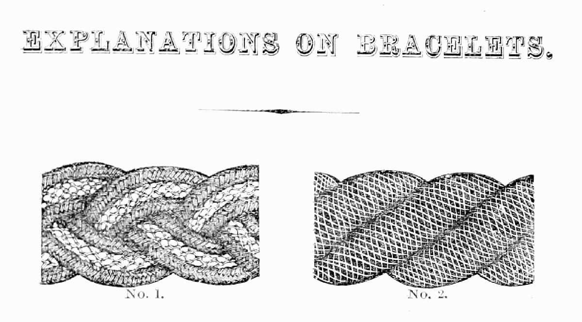 Braid this over a mold, made of small wire, with a hole in one end like the eye of a needle, so as to draw a small cord in the place of the wire. When you have it braided, take off the weights, tie the ends fast on the wire, and push the braid tight together; then boil in water about ten minutes, and take it out and put in an oven as hot as it will bear without burning, until quite dry; then slip it off the wire on to the cord, sew the ends of the braid so it will not slip, and put a little shellac on the end to keep it fast. If you want it elastic, use elastic cord. To vary the size of the braid, vary the number of hairs in a strand.