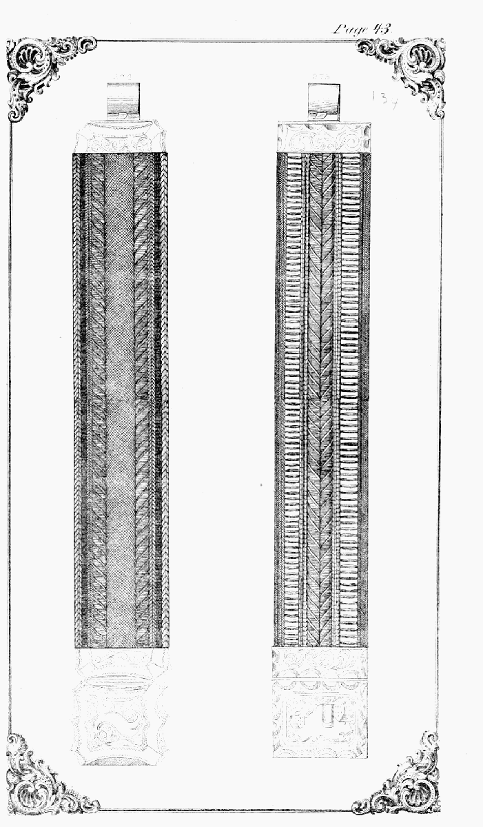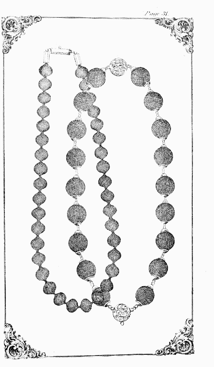 Braid it over wood, or brass wire, the size and length you wish your chain. When braided take off your weights, tie the ends fast and boil and dry, then take out the mold and put a cord through with some cotton wrapped around it so it will be soft and pliable. This is called the Striped Snake Braid, and can be braided all of one color if desired.