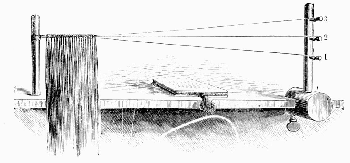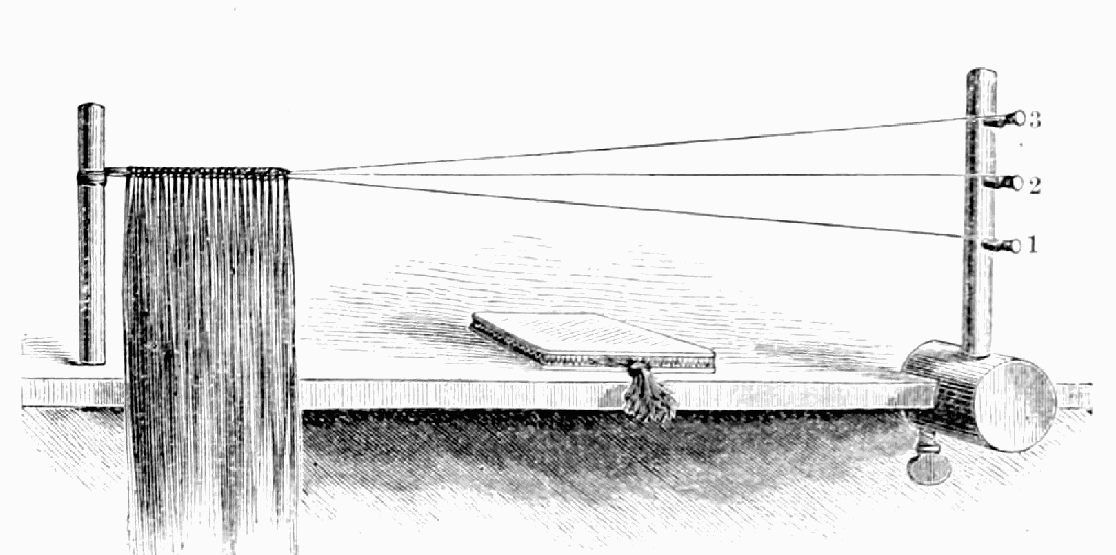 Braid this over a small wire, with a hole in one end like the eye of a needle, so as to draw a small cord in the place of the wire. When you have it braided, take off your weights, tie the ends fast on the wire and push the braid together on the wire, then boil in water about ten minutes; then take it out and put in an oven as hot as it will bear without burning, until it is quite dry; then take it out and slip it off of the wire on to the cord, and sew the ends of the braid so it will not slip on the cord, and put a little shellac on the end to keep it fast. If you want it elastic, use elastic cord. To vary the size of the braid, vary the number of hairs in a strand.