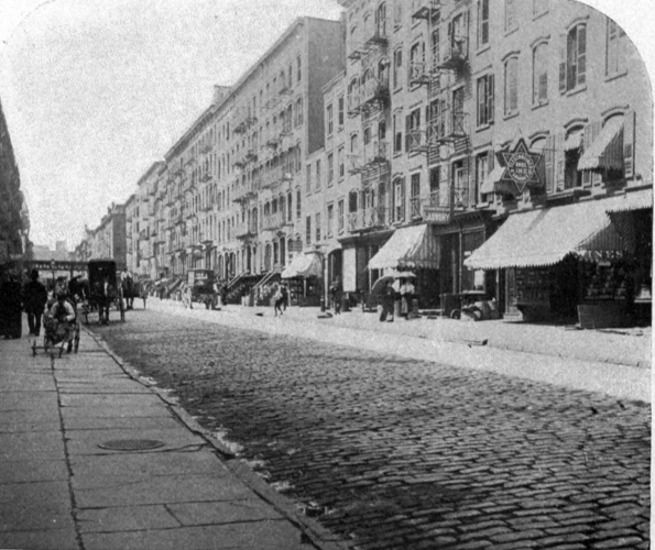 No. 98 Catherine Street: "The floor in the apartments and the wooden steps leading to the second-floor apartment are broken, loose, saturated with filth. The roof and eaves gutters leak, rendering the apartments wet. The two apartments on the first floor consist of one room each, in which the tenants are compelled to cook, eat, and sleep. The back walls are defective; the house wet and damp, and unfit for human habitation. It robs the surrounding houses of light."