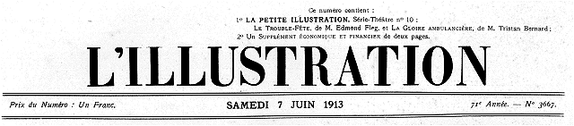 Project Gutenberg's L'Illustration, No. 3667, 7 Juin 1913, by Various This eBook is for the use of anyone anywhere at no cost and with almost no restrictions whatsoever. You may copy it, give it away or re-use it under the terms of the Project Gutenberg License included with this eBook or online at www.gutenberg.org Title: L'Illustration, No. 3667, 7 Juin 1913 Author: Various Release Date: February 13, 2012 [EBook #38868] Language: French Character set encoding: ISO-8859-1 *** START OF THIS PROJECT GUTENBERG EBOOK L'ILLUSTRATION, 7 JUIN 1913 *** Produced by Jeroen Hellingman et Rénald Lévesque