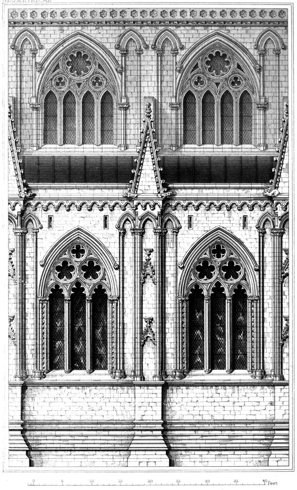 For nearly three-quarters of a century after its introduction the Tracery of windows contained forms in which that simplest of all Geometrical figures, the Circle, was principally conspicuous: and although, in the latter part of this Period, the Circle does not obtain the same prominent place, in the centre of the window-head, and as the principal feature of the design, that is generally allotted to it in the earlier examples, yet the important part that it bears in the construction of the design of even the whole of these later examples, fully justifies the application of the term, already pretty generally in use, to this class of windows; and entitles us to call this Period after that figure, and "par excellence," the GEOMETRICAL PERIOD.