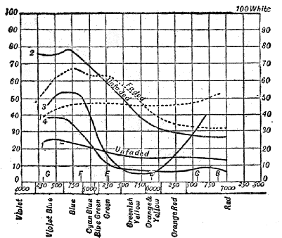 Perhaps the meaning of these terms may require to be explained. The hue of a colour is what in common parlance is often called the colour. Thus we talk of rose, violet, magenta, emerald green, and so on, but for measuring purposes the hue had best be referred to the spectrum colours as a standard (the means of doing so will be shortly explained), for they are simple colours, which can be expressed [Pg 16] by numbers. Compound colours, which it may be said are invariably to be found in nature, being mixtures of simple colours, can be just as readily referred to the spectrum. By the luminosity of a colour we mean its brightness, the standard of reference being the brightness of a white surface when illuminated by the same white light. By the purity of a colour we mean its freedom from admixture with white light. An example of different degrees of purity will be found in washes of water-colours of different tenuity. Thus if we wash a sheet of paper with a light tint of carmine, the whiteness of the paper is not obliterated; if we pass another wash over it the whiteness of the paper is lessened, and so on. The lightest tint is that which is most lacking in purity.
