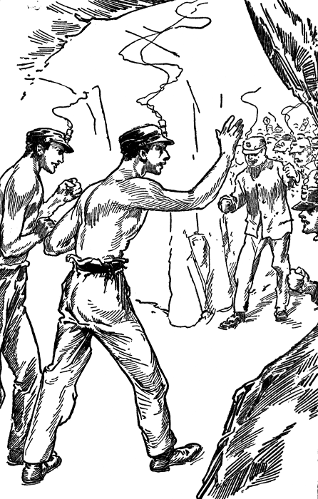 [pg 15] Steve Rush breathed a deep sigh of relief. He knew that he could have held on but a few minutes longer. His arms were at the point of giving out when the Italian had begun to climb. But now he felt that they were all safe for the moment, though there was only a slender iron bar between them and destruction at the bottom of the shaft.