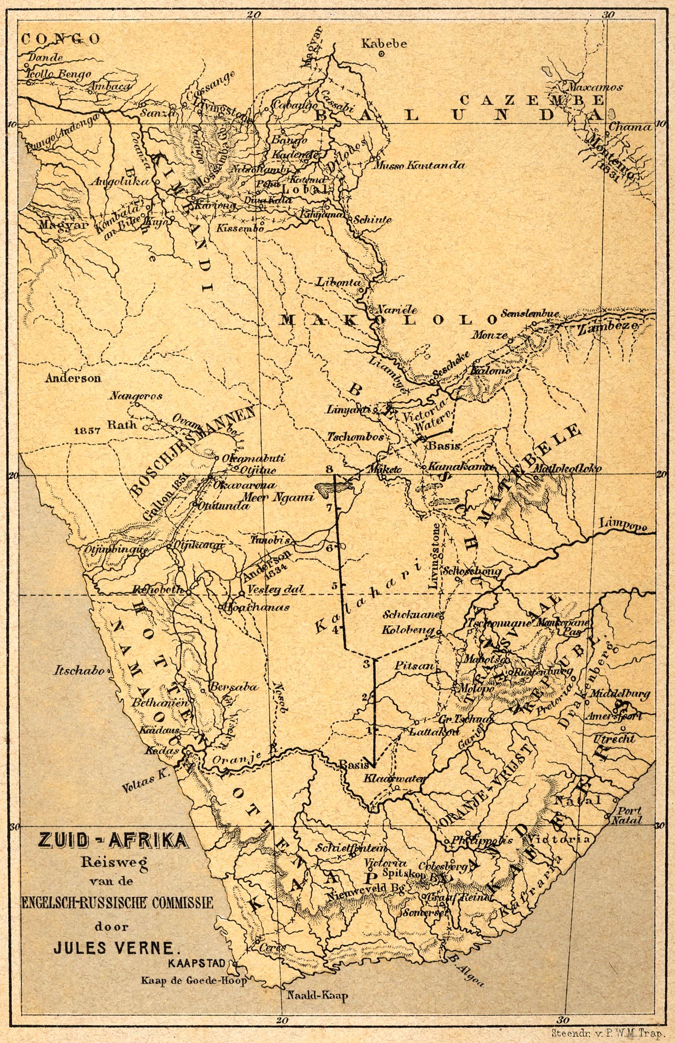 De jonge geleerde, die een onuitputtelijk geduld bezat, begon voor de twintigste maal het verhaal weder dat hij reeds zoo dikwijls aan den jager gedaan had. In de laatste dagen van het vorige jaar had William Emery een brief ontvangen, die hem de spoedige komst meldde van kolonel Everest en van eene wetenschappelijke internationale commissie, die naar zuidelijk Afrika bestemd was. Welke waren de plannen van deze commissie, waarom ging zij naar het uiteinde van het Afrikaansche vasteland? Emery kon het niet zeggen, daar de brief van den heer Airy op dat punt het stilzwijgen bewaarde. Volgens de ontvangen opgaven had hij zich gehaast om te Lattakou, een van de noordelijkste stations in het land der Hottentotten, wagens, levensmiddelen, in één woord al wat er tot onderhoud van een karavaan van Boschjesmannen noodig was, bijeen te brengen. Daarna bood hij het bevel over den tocht aan den inlandschen jager Mokum aan, dien hij bij geruchte kende, die Anderson vergezeld had op zijne jachten in westelijk Afrika, en Livingstone bij zijn eersten tocht naar het meer Ngami en naar den waterval van den Zambese.