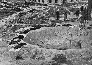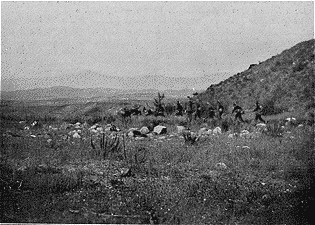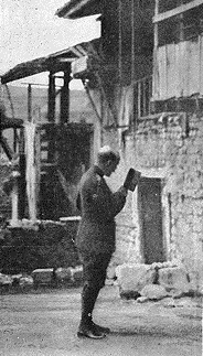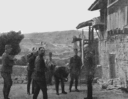 Le commandant du groupe de campagne qui occupe la crête, le major d'artillerie Lazarewitch, nous fait les honneurs du réduit où se trouve installé son poste d'observation. Aussi loin que la vue peut s'étendre, rien ne bouge, rien ne se meut, c'est l'immobilité complète, comme si, tacitement, une trêve était intervenue entre les deux adversaires. Seuls dans le lointain, tout à fait dans le nord, de sourds grondements se font entendre. Ils viennent de la direction de Golech et, en observant avec attention les pentes lointaines du Golemi-Vrh, nos jumelles nous permettent d'apercevoir les points d'éclatement des shrapnells.