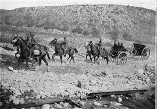 Partis de bonne heure, nous atteignons, au-dessus de Kosara, la ligne de faîte qui, formant saillant en cet endroit, face à la direction de la route de Kustendil, est occupée fortement. Un ouvrage de campagne à profil renforcé, entouré d'un épais réseau de fils de fer barbelés, occupe le point principal'de la position. A gauche, s'étagent deux batteries de 75; à droite, une autre batterie de campagne est placée légèrement en arrière de la crête. Elle est prolongée par une batterie mixte composée d'une pièce longue de siège du calibre de 120mm et de trois obusiers de 120mm à tir rapide, système Schneider. L'infanterie est bivouaquée en arrière.
