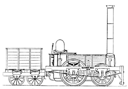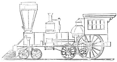 The "Ironsides" was a four-wheeled engine, modeled essentially on the English practice of that day, as shown in the "Planet" class, and weighed, in running order, something over five tons. The rear or driving-wheels were fifty-four inches in diameter on a crank-axle placed in front of the fire-box. The cranks were thirty-nine inches from centre to centre. The front wheels, which were simply carrying wheels, were forty-five inches in diameter, on an axle placed just back of the cylinders. The cylinders were nine and one-half inches in diameter by eighteen inches stroke, and were attached horizontally to the outside of the smoke-box, which was D-shaped, with the sides receding inwardly, so as to bring the centre line of each cylinder in line with the centre of the crank. The wheels were made with heavy cast-iron hubs, wooden spokes and rims, and wrought-iron tires. The frame was of wood, placed outside the wheels. The boiler was thirty inches in diameter, and contained seventy-two copper flues, one and one-half inches in diameter and seven feet long. The tender was a four-wheeled platform, with wooden sides and back, carrying an iron box for a water-tank, inclosed in a wooden casing, and with a space for fuel in front. The engine had no cab. The valve-motion was given by a single loose eccentric for each cylinder, placed on the axle between the crank and the hub of the wheel. On the inside of the eccentric was a half-circular slot, running half-way around. A stop was fastened to the axle at the arm of the crank, terminating in a pin which projected into the slot. This pin would thus hold the eccentric at one end or the other of the half-circular slot, and the engine was reversed by moving the eccentric about the axle, by means of movable hand-levers set in sockets in the rock-shafts, until it was arrested and held by the pin at one end or the other of the slot. The rock-shafts, which were under the footboard, had arms above and below, and the eccentric-straps had each a forked rod, with a hook, or an upper and lower latch or pin, at (p. 8) their extremities, to engage with the upper or lower arm of the rock-shaft. The eccentric-rods were raised or lowered by a double treadle, so as to connect with the upper or lower arm of the rock-shaft, according as forward or backward gear was desired. A peculiarity in the exhaust of the "Ironsides" was that there was only a single straight pipe running across from one cylinder to the other, with an opening in the upper side of the pipe, midway between the cylinders, to which was attached at right angles the perpendicular pipe into the chimney. The cylinders, therefore, exhausted against each other; and it was found, after the engine had been put in use, that this was a serious objection. This defect was afterwards remedied by turning each exhaust-pipe upward into the chimney, substantially as is now done. The steam-joints were made with canvas and red-lead, as was the practice in English locomotives, and in consequence much trouble was caused, from time to time, by leaking.