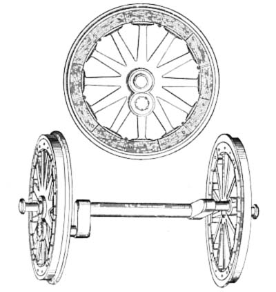 April 3, 1835, Mr. Baldwin took out a patent for certain improvements in the wheels and tubes of locomotive engines. That relating to the wheels provided for casting the hub and spokes together, and having the spokes terminate in segments of a rim, as described in his patent of September 10, 1834. Between the ends of the spokes and the tires wood was interposed, and the tire might be either of wrought-iron or of chilled cast-iron. The intention was expressed of making the tire usually of cast-iron chilled. The main object, however, was declared to be the interposition between the spokes and the rim of a layer of wood or other substance possessing some degree of elasticity. This method of making driving-wheels was followed for several years.